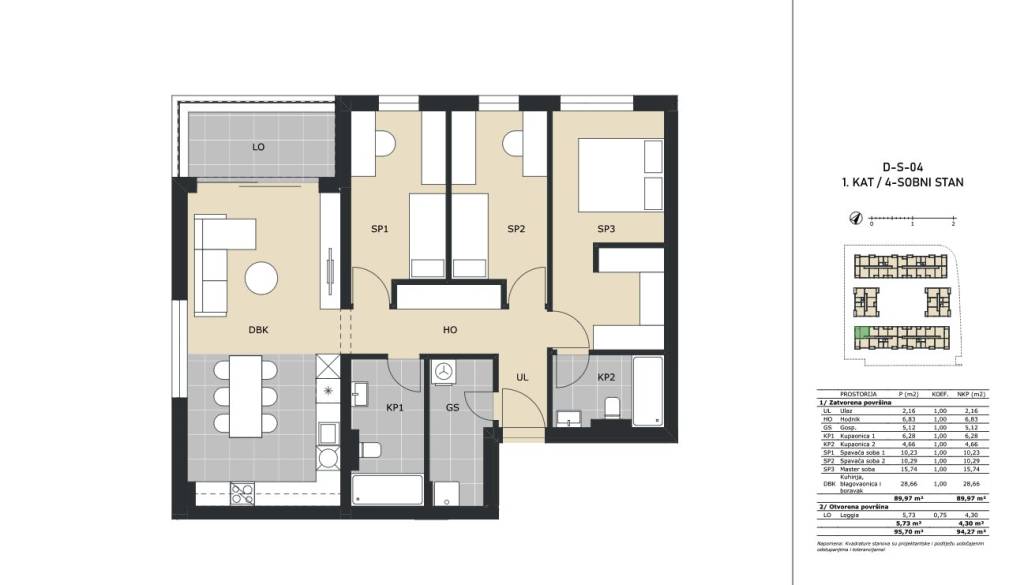 Četverosoban stan na 1. katu stambene zgrade zatvorene površine 89,97 m2 s loggiom 5,73 m2 (4,30 m2), ukupne neto površine 94,27 m2.Stan D-4 sastoji se od ulaznog hodnika, kuhinje s blagovaonicom i dnevnim boravkom, predsoblja, tri spavaće sobe, dvije kupaonice, gospodarstva i loggie.Obvezna kupnja spremišta, vanjskog ili garažnog parkirnog mjesta.Stan se nalazi u višestambenoj zgradi unutar kompleksa koji će se sastojati od 165 stambenih jedinica.Green Side Residence nalazi se u Velikoj Gorici, samo 10 kilometara od Zagreba i tek 3 kilometra od Međunarodne zračne luke Zagreb, lokacija nudi izvrsnu prometnu povezanost s glavnim gradom i cijelom Hrvatskom, zahvaljujući neposrednom pristupu dvjema autocestama.Okružen zelenilom, a opet u blizini svih gradskih sadržaja, ovaj projekt predstavlja idealan izbor za miran, ali povezan život.Useljenje 11/2027. godine.Za sve ostale informacije stojimo na raspolaganju.... Više na eurovilla.hr, ID: 574387