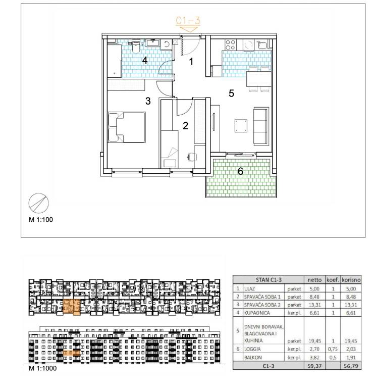 Trosoban stan površine 56,79 m2 smješten na 1. katu.Stan C1-3 sastoji se od ulaza, 2 spavaće sobe, kupaonice, dnevnog boravka, kuhinje s blagovaonicom, balkona te loggije.Velika Gorica, projekt stambene novogradnje namijenjen stalnom stanovanju, koji obuhvaća 91 stambenu jedinicu. U sklopu zgrade osigurano je ukupno 182 garažnih i parkirnih mjesta, od čega je 28 garažnih mjesta smješteno u prizemlju, 97 garažnih i parkirnih mjesta u podzemnoj etaži te dodatnih 57 parkirnih mjesta na razini terena.Uz kupnju stana obavezna je kupnja garažnog mjesta na -1 etaži po cijeni od 25.000,00 EUR ili garažnog mjesta na 0 etaži po cijeni od 30.000,00 EUR zajedno s parkirnim garažnim mjestom po cijeni od 18.000,00 EUR ili vanjskim parkirnim mjestom po cijeni od 10.000,00 EUR. Dakle, garažno mjesto na -1 etaži ili garažno mjesto na 0 etaži + garažno parkirno mjesto ili vanjsko parkirno mjesto.Građevina je projektirana kao armiranobetonska konstrukcija, međusobno povezana zidovima i gredama, s punim armiranobetonskim stropnim pločama i ravnim krovom. Vertikalni konstruktivni sustav čine armiranobetonski zidovi debljine 20 cm izvedeni kroz sve etaže, dok horizontalni sustav čine armiranobetonske ploče debljine 20 cm.Pročelje je predviđeno s toplinskom izolacijom debljine 15 cm u ETICS sustavu, izvedenom od EPS-a, a u zonama požarnih prekida, u kontaktu sa stubištem i na podgledu prizemlja od mineralne vune iste debljine. Završna obrada izvodi se armiranom mrežicom, gletanjem i završnim slojem u boji i teksturi prema projektu. Vanjska stolarija predviđena je kao PVC, u tonu definiranom projektom.Krov je projektiran kao ravni neprohodni krov, a svi slojevi izvedeni su u skladu s projektom fizike zgrade. Unutarnji pregradni zidovi izvode se kao gipskartonski, debljine 10 do 20 cm, ovisno o namjeni prostora, uz primjenu potrebne zvučne izolacije gdje je to predviđeno. Zidne površine su završno obrađene soboslikarskim radovima u boji prema projektu.Podovi u stanovima izvode se kao plivajući sustav s toplinskom izolacijom od polistirena i cementnim estrihom. Završne podne obloge predviđene su prema namjeni prostora: keramika u sanitarijama, kuhinjama i na vanjskim površinama, a troslojni hrastov parket u dnevnim boravcima, blagovaonicama, ulaznim prostorima i spavaćim sobama. U ponudi su tri varijante keramičkih pločica.Grijanje je riješeno plinskim etažnim podnim sustavom. Stanovi su opremljeni klima uređajima marke Bosch, PVC stolarijom s električnim roletama, troslojnim hrastovim parketom te sobnim vratima proizvođača RV Križevci. Ulazna vrata u stanove su protuprovalna, proizvođača Kolnoa sa sustavom zaključavanja Multilock.Useljenje 05/27Za sva pitanja Vam stojimo na raspolaganju.... Više na eurovilla.hr, ID: 600075