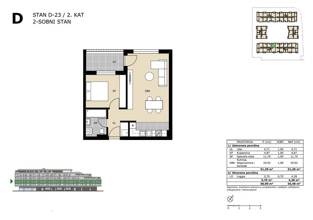Dvosoban stan na 2. katu stambene zgrade zatvorene površine 51,20 m2 s loggijom 5,70 m2 (4,28 m2) te), ukupne neto površine 55,48 m2.Stan D-23 sastoji se od ulaza, kupaonice, spavaće sobe, kuhinje s blagovaonicom te dnevnog boravka.Obvezna kupnja spremišta, vanjskog ili garažnog parkirnog mjesta.Stan se nalazi u višestambenoj zgradi unutar kompleksa koji će se sastojati od 165 stambenih jedinica.Green Side Residence nalazi se u Velikoj Gorici, samo 10 kilometara od Zagreba i tek 3 kilometra od Međunarodne zračne luke Zagreb, lokacija nudi izvrsnu prometnu povezanost s glavnim gradom i cijelom Hrvatskom, zahvaljujući neposrednom pristupu dvjema autocestama.Okružen zelenilom, a opet u blizini svih gradskih sadržaja, ovaj projekt predstavlja idealan izbor za miran, ali povezan život.Useljenje 11/2027. godine.Za sve ostale informacije stojimo na raspolaganju.... Više na eurovilla.hr, ID: 693750