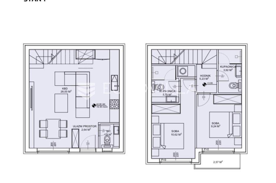 U predivnom malenom mjestu Sv. Petar na Moru gradi se moderni stambeni objekt s 9 stambenih jedinica na udaljenosti od plaže od 180 m.Dvoetažni stan S1 koji se nalazi u prizemlju i na prvom katu objekta površine 72,55 m2, sastoji se od prostranog dnevnog prostora površine 28 m2 (kuhinja, blagovaonica i dnevni boravak), dvije spavaće sobe površina 10 m2 i 9 m2, dvije kupaonice, lođe i natkrivene terase.Stanu pripada vrt površine 44 m2 i vanjsko parkirno mjesto.Stan će biti opremljen klima uređajima u spavaćim sobama i dnevnom prostoru. U kupaonicama će biti postavljeno podno grijanje a podne obloge će biti od laminat parketa ili keramičkih pločica. Stakla su troslojna a vanjska izolacija je od 10 cm stiropora.Ukupna obračunska površina stana je 79,80 m2.Objekt je orijentacije jug.Predviđeni završetak radova i useljenje je do kraja 2027 godine.Malo o lokaciji: mjesto Sveti Petar na Moru je dio općine Sveti Filip i Jakov i udaljen je 20 km jugoistočno od grada Zadra i svega 8 km sjeverozapadno od starog kraljevskog grada Biograd na Moru.U neposrednoj blizini nalaze se prekrasne plaže a u akvatoriju mjesta se nalazi nekoliko malih otočića zbog čega je ovo mjesto zahvalno za ljubitelje brodskih izleta.Na području općine Sveti Filip i Jakov poznati su vrijedni arheološki nalazi i sakralni spomenici, te karakteristični autentični lokaliteti. Cjelokupno područje općine predstavlja izuzetnu arheološku cjelinu pa je poželjna destinacija za sve ljubitelje istraživanja prirode i bogate prošlosti.Dodatne informacije - udaljenosti od važnijih lokacija:More: 180 m / Plaža: 180 m / Zadar 20 km / Zračna luka 15 kmKupovina: 100 m / restoran: 100 m / ljekarna 5 km / centar mjesta 200 mZa sva dodatna pitanja stojim na raspolaganju.... Više na eurovilla.hr, ID: 702284