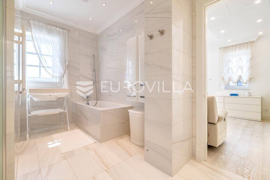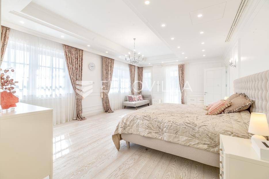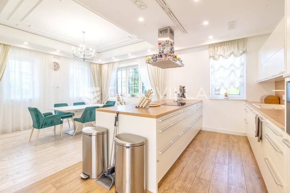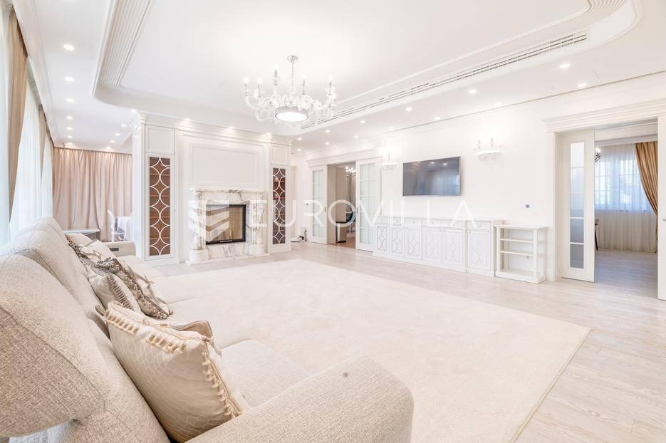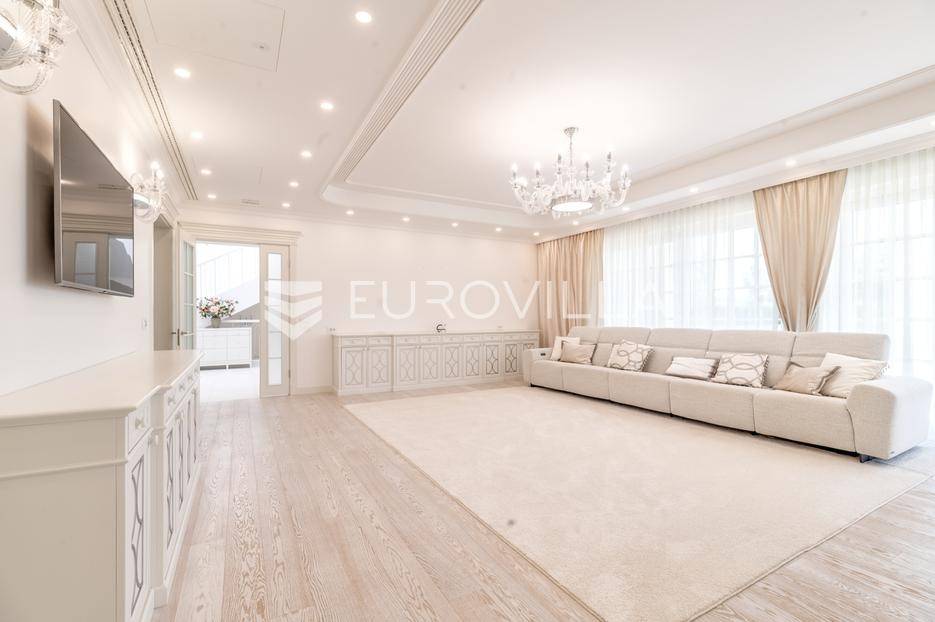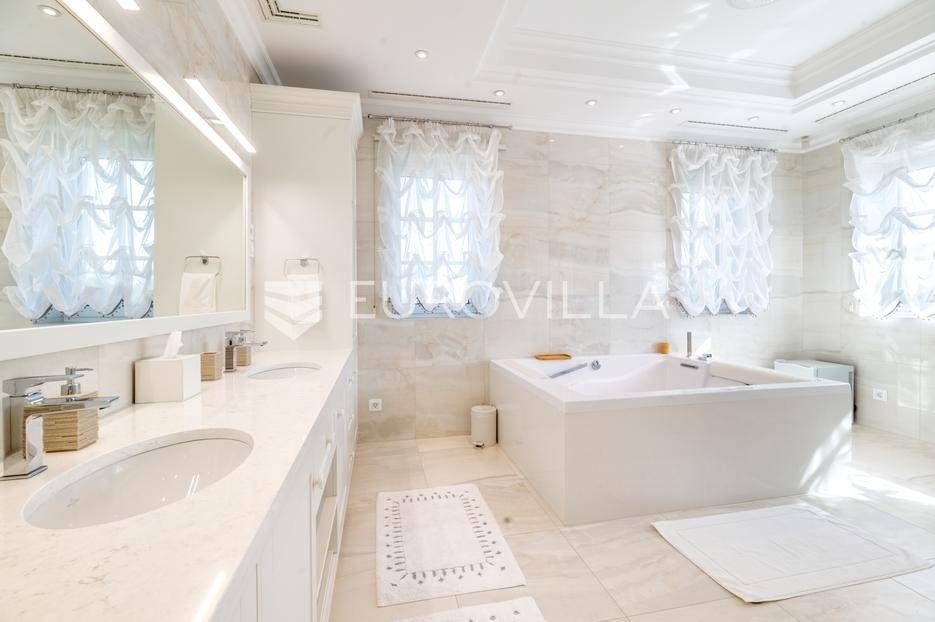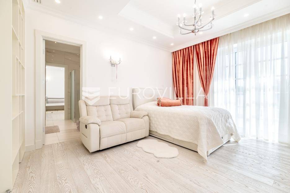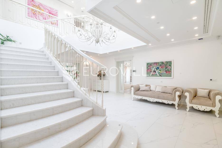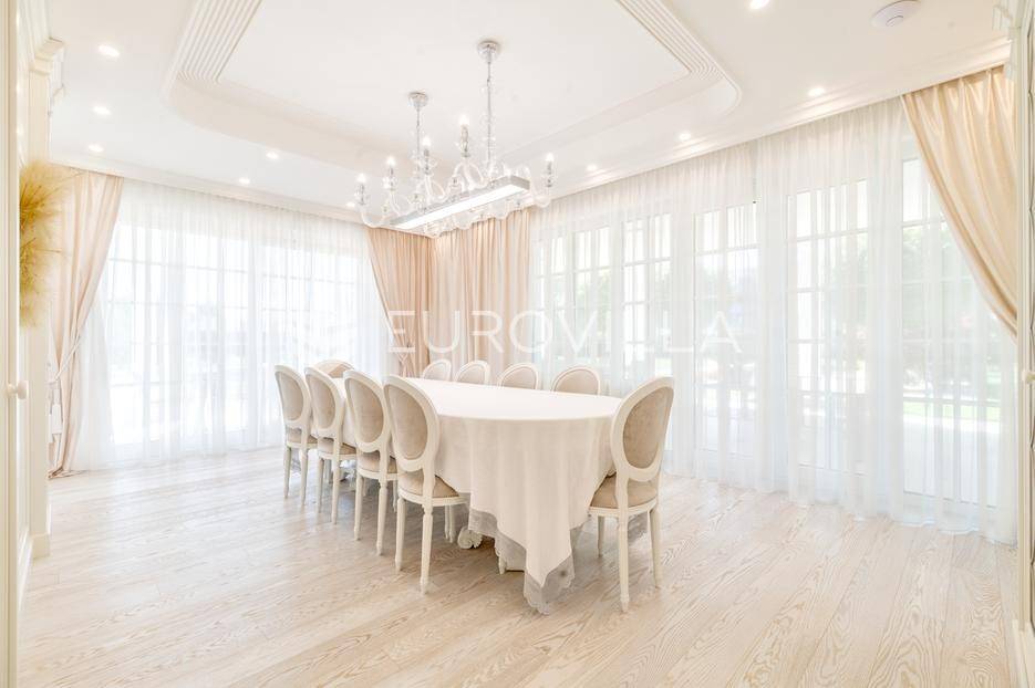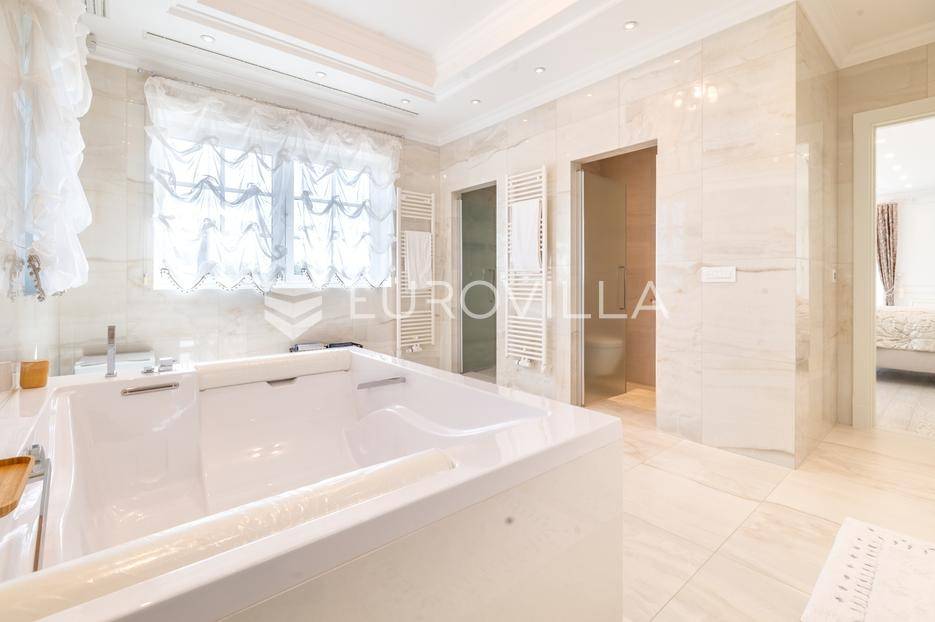 Novi Zagreb, Blato, jedinstvena lokaciji, luksuzna vila ukupne površine 1200 m2, novije gradnje iz 2020. godine s bazenom od 100 m2, uređenim dvorištem i okućnicom, ljetnom kuhinjom, dječjim igralištem, šetnicama i prekrasnim vrtom. U sklopu objekta se nalazi garaža za četiri vozila s toplim putem te mogućnost parkiranja više vozila na popločenom dijelu dvorišta.Vila je izgrađena na tri etaže, međusobno povezane unutarnjim stubištem, na parceli od 6.750 m2.Podrum: hodnik, spa prostor s unutarnjim bazenom, turskom i finskom saunom, slanom sobom i sobom za masažu, kino dvorana, vinoteka, konoba, tri sobe za osoblje s pripadajućim kupaonicama, kuhinja za osoblje, spremište. Etaža -1 ima direktan pristup prema dvorištu.Prizemlje: ulazni hodnik, prostorija za doček gostiju, prostrani dnevni boravak s izlazom na terasu i dvorište, blagovaonica, kuhinja s dodatnom blagovaonicom, tri garderobe, igraonica, kupaonica, gostinjski wc, predsoblje i stubište.Prvi kat: dodatni boravak, master soba s kupaonicom, dvije spavače s pripadajućim kupaonicama, dvije spavaće sobe s zajedničkom kupaonicom, teretana, gostinjski wc, natkrivena i nenatkrivena terasa.Vrhunska gradnja alu stolariju, troslojna stakla s električnim roletama, podno grijanje, armirano-betonska konstrukcija, energetski certifikat A, klimatizirane sve prostorije, ulazna ograda na daljinski i video nadzor.Svojim jedinstvenim položajem u neposrednoj blizini grada, vila osigurava mjesto idealno za življenje ali postoji mogućnost korištenja i kao rezidencija, ambasada, konzulat, ordinacija, klinika i sl. Nalazi se na vrlo atraktivnoj lokaciji u blizini javnog prijevoza i svih sadržaja potrebnih za kvalitetan i miran život.Za ostale informacije stojimo Vam na raspolaganju.... Više na eurovilla.hr, ID: 756388