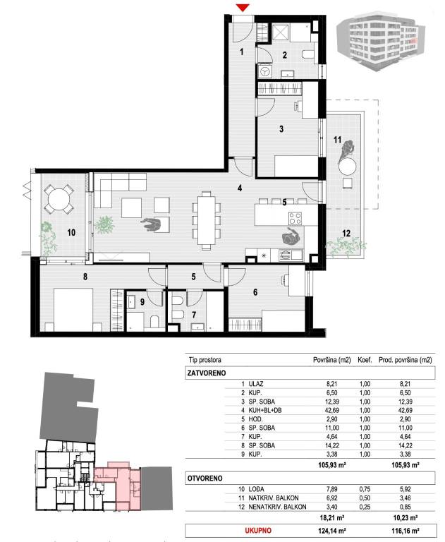 Langov Trg / Novakova, luksuzna novogradnja na jednoj od najboljih i najatraktivnijih lokacija u gradu. Nalazi se samom početku Ribnjaka sa pogledom na Katedralu, 3 min lagane šetnje do Trga bana Josipa Jelačića. U blizini svih važnih sadržaja za život: trgovine, javnog prijevoza, ljekarne, škole, vrtića...Zgrada ima 3 podzemne etaže, prizemlje i 6 katova, ukupno 21 stambena jedinica. Svakom stanu pripada spremište i parkirno mjesto u garaži.četverosoban stan na drugom katu, zatvorene površine 105,93 m2, sa loggiom, natkrivenom i nenatkrivenom terasom 18,21m2 (10,23). Ukupno obračunski 116,16m2, spremište na etaži -1 površine 3,52m2, Garažno parkirno mjesto 8 na etaži -2 površine 14,45m2. Ukupno 125,16m2.Sastoji od ulaznog prostora, 3 spavaće sobe, 3 kupaonice, radne sobe, dnevnog boravka s kuhinjom i blagovaonicom, loggie i terase. Orijentiran sjever jug. Spavaće sobe na dvorišnu mirnu stranu.Gradnja izuzetno kvalitetna:2 liftadizalica topline - podno grijanjeklimatizirane sve prostorijevanjska stolarija sa električne roletama i alu griljamaograde na loggiama staklenestubišta keramika velikih formata i ograda od plastificiranog čelikapriprema za videonadzorprotuprovalna vratasmart homeparket hrast I. klase, višeslojni prema izboru kupcakeramika gres I. klase velikih dimenzijasanitarije visoki standardventilirana fasada sa ulične strana, a sa dvorišne strane STO fasadavisina stropa 265cmU garaži opcija za ugradnju punjača za električni automobilZavršetak i useljenje 03/2026.Za sve ostale informacije stojimo na raspolaganju.... Više na eurovilla.hr, ID: 769036