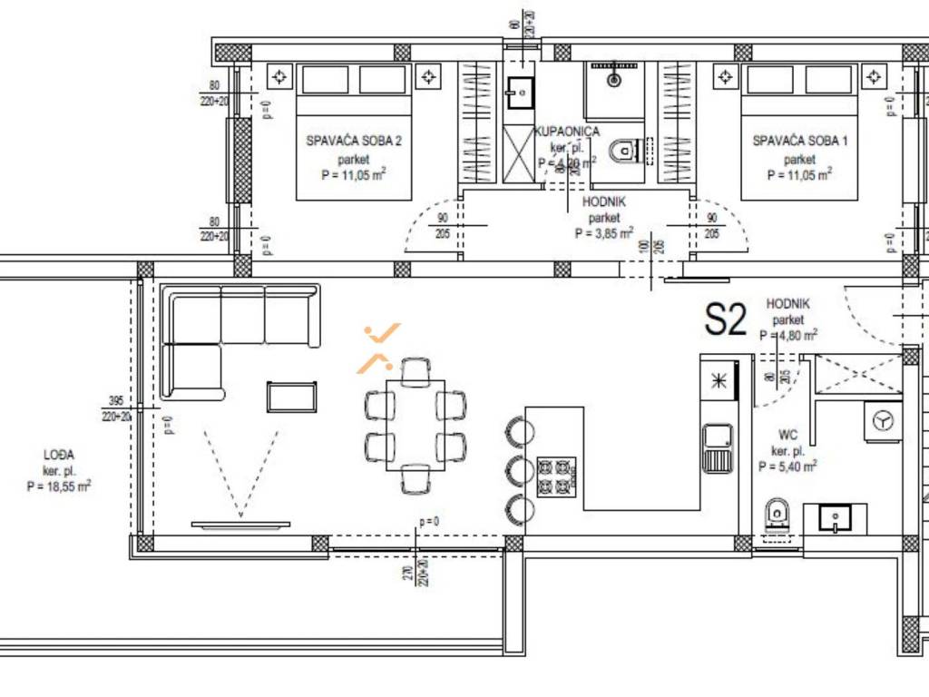 The layout comprises an entrance hall, two bedrooms, a bathroom, a separate WC, an open-concept kitchen with dining area and living room, and a loggia. The net usable interior area amounts to 89,32 m2. The apartment includes one parking space. The total net usable area with all appurtenances is 92,07 m2.