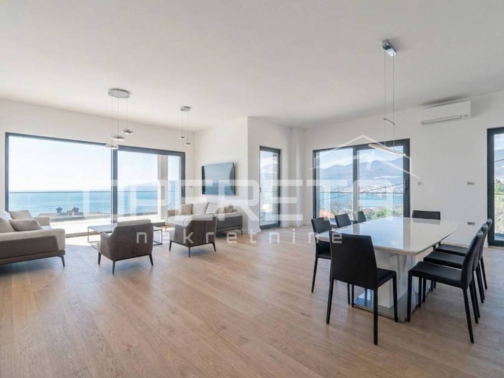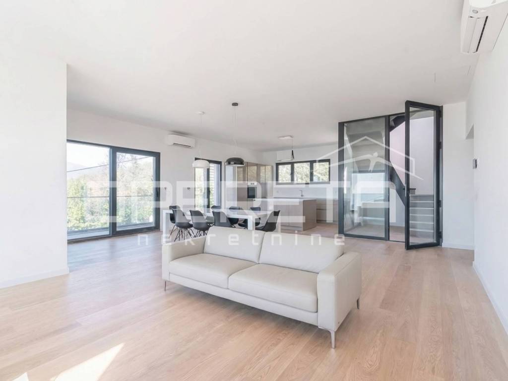 An exclusive penthouse is offered in the attic of a modern new development located in one of the most desirable areas of Rijeka Bivio. The building comprises only five apartments and offers future owners access to shared amenities such as a fitness room, storage facilities, and a garage, ensuring a high level of comfort and privacy.