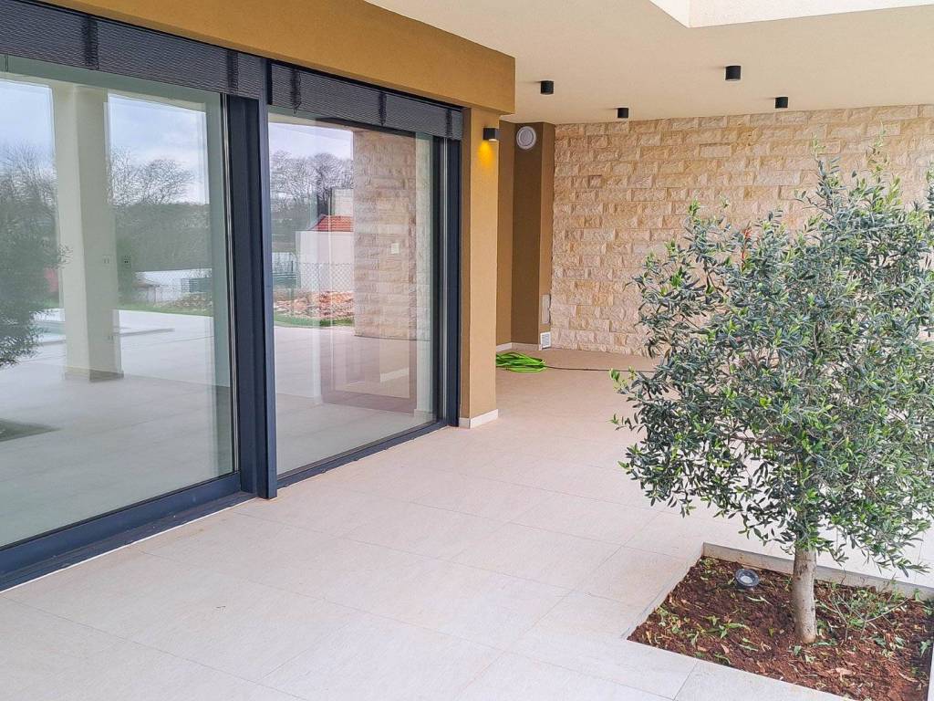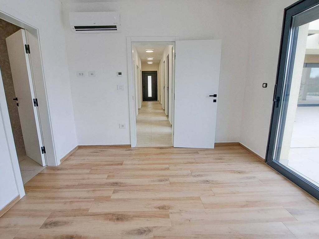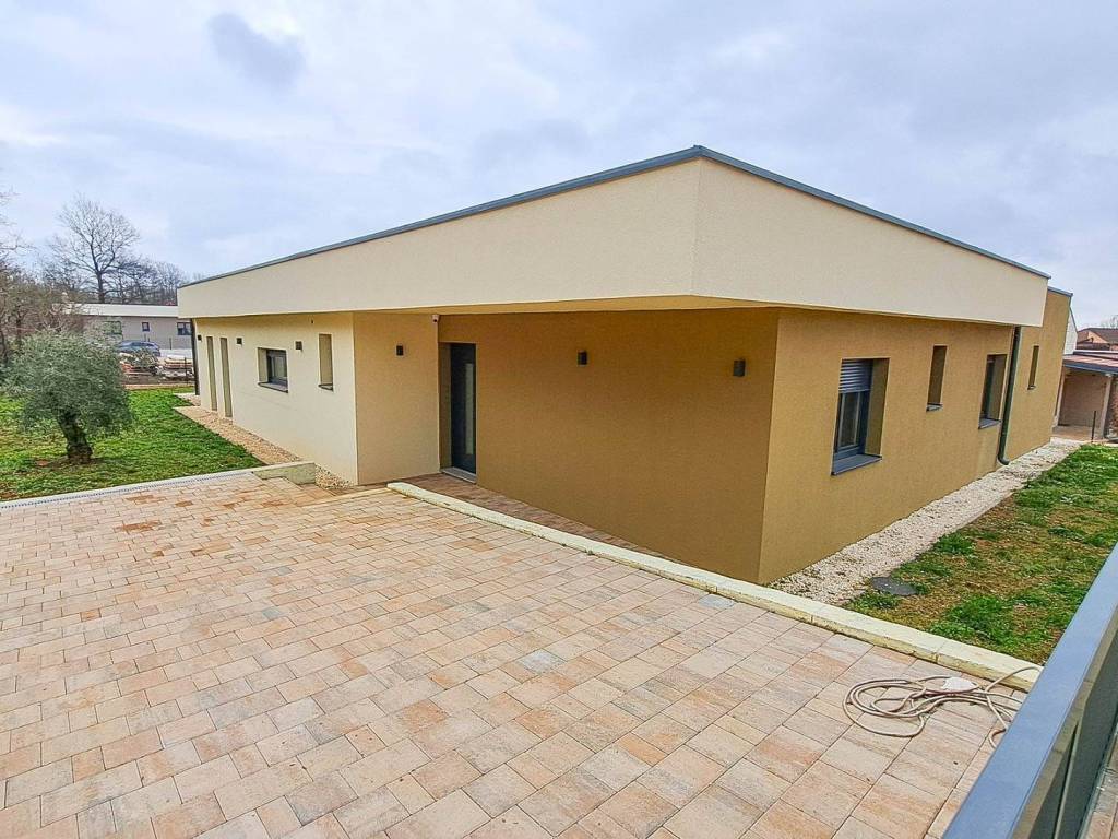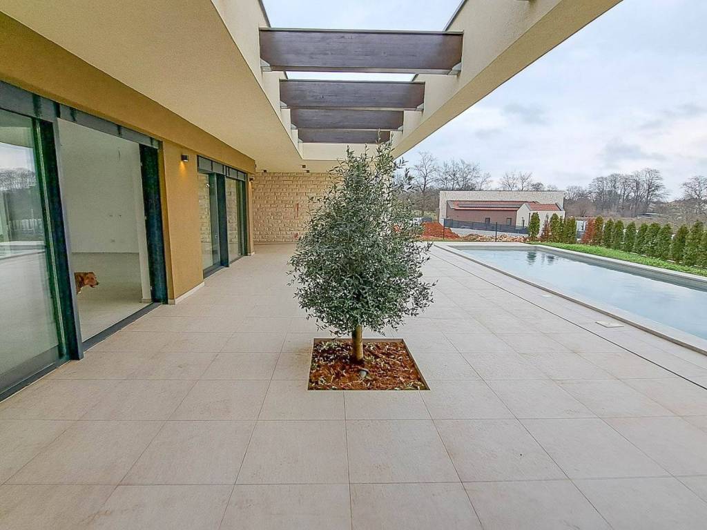 The house features a large and sunlit living room with kitchen and dining area, as well as three spacious bedrooms, each with its own en-suite bathroom. In front of the living room there is a terrace with a pergola and a heated outdoor swimming pool. A summer kitchen is planned on the terrace.