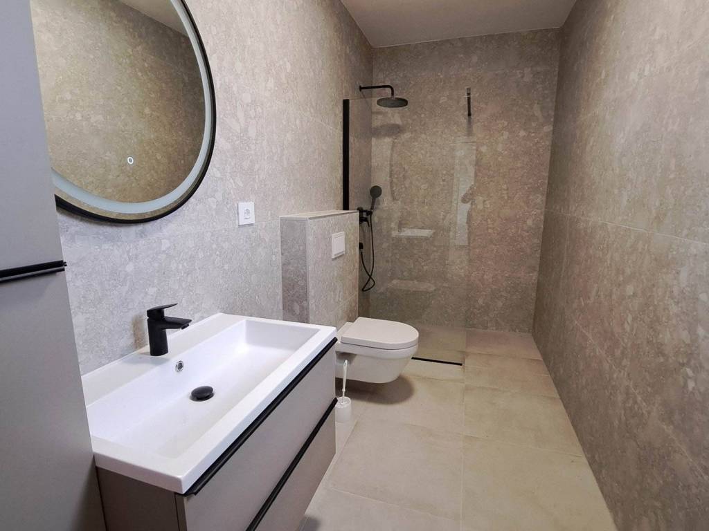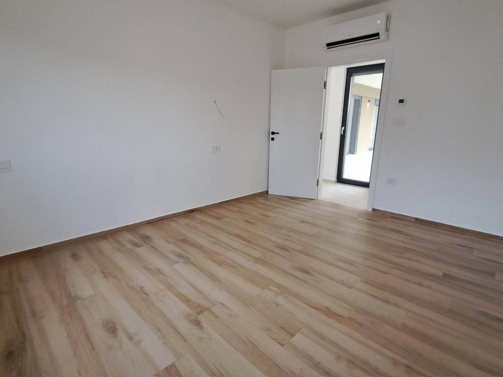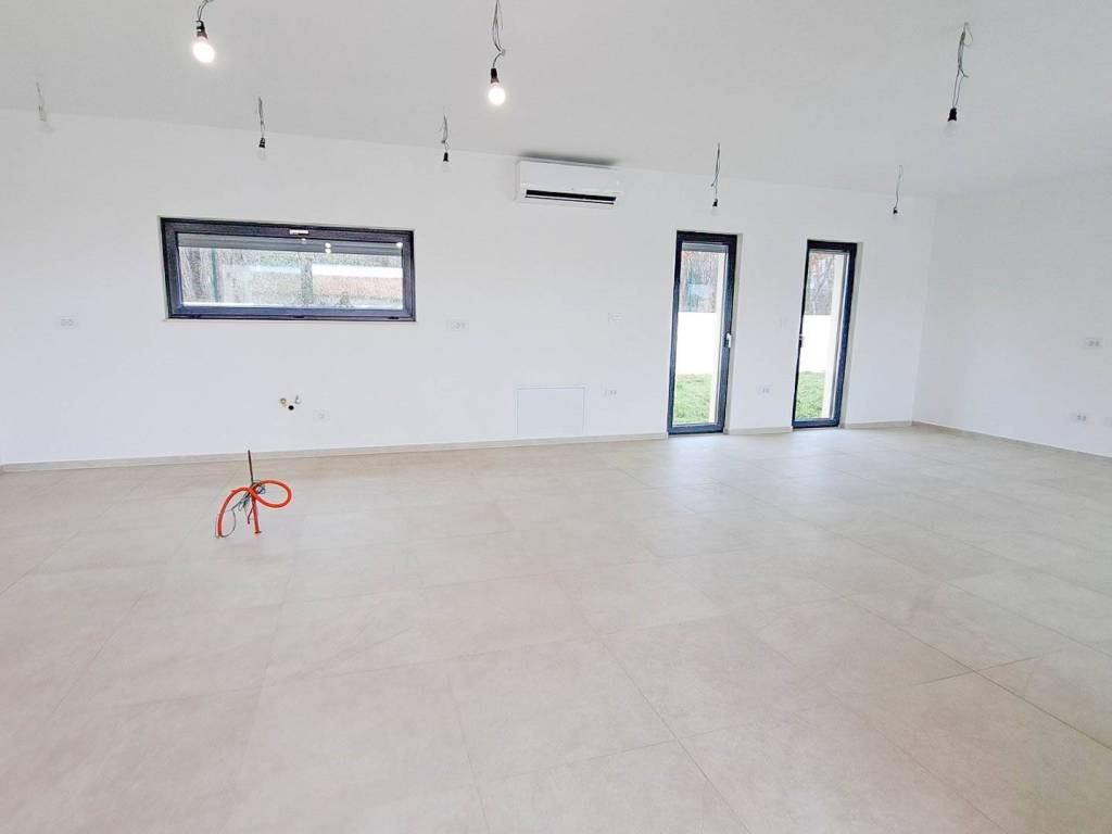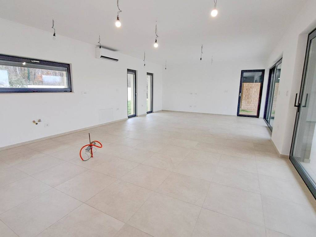 The house features a large and sunlit living room with kitchen and dining area, as well as three spacious bedrooms, each with its own en-suite bathroom. In front of the living room there is a terrace with a pergola and a heated outdoor swimming pool. A summer kitchen is planned on the terrace.