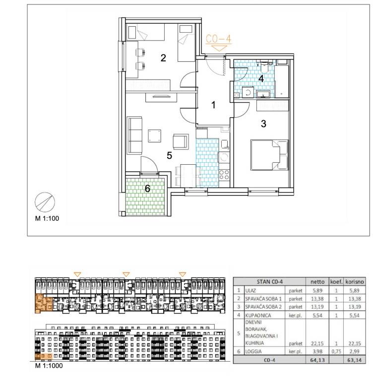 Trosoban stan površine 63,14 m2 smješten u prizemlju.Stan C0-4 sastoji se od ulaza, 2 spavaće sobe, kupaonice, dnevnog boravka, kuhinje s blagovaonicom, loggije.Velika Gorica, projekt stambene novogradnje namijenjen stalnom stanovanju, koji obuhvaća 91 stambenu jedinicu. U sklopu zgrade osigurano je ukupno 182 garažnih i parkirnih mjesta, od čega je 28 garažnih mjesta smješteno u prizemlju, 97 garažnih i parkirnih mjesta u podzemnoj etaži te dodatnih 57 parkirnih mjesta na razini terena.Uz kupnju stana obavezna je kupnja garažnog mjesta na -1 etaži po cijeni od 25.000,00 EUR ili garažnog mjesta na 0 etaži po cijeni od 30.000,00 EUR zajedno s parkirnim garažnim mjestom po cijeni od 18.000,00 EUR ili vanjskim parkirnim mjestom po cijeni od 10.000,00 EUR. Dakle, garažno mjesto na -1 etaži ili garažno mjesto na 0 etaži + garažno parkirno mjesto ili vanjsko parkirno mjesto.Građevina je projektirana kao armiranobetonska konstrukcija, međusobno povezana zidovima i gredama, s punim armiranobetonskim stropnim pločama i ravnim krovom. Vertikalni konstruktivni sustav čine armiranobetonski zidovi debljine 20 cm izvedeni kroz sve etaže, dok horizontalni sustav čine armiranobetonske ploče debljine 20 cm.Pročelje je predviđeno s toplinskom izolacijom debljine 15 cm u ETICS sustavu, izvedenom od EPS-a, a u zonama požarnih prekida, u kontaktu sa stubištem i na podgledu prizemlja od mineralne vune iste debljine. Završna obrada izvodi se armiranom mrežicom, gletanjem i završnim slojem u boji i teksturi prema projektu. Vanjska stolarija predviđena je kao PVC, u tonu definiranom projektom.Krov je projektiran kao ravni neprohodni krov, a svi slojevi izvedeni su u skladu s projektom fizike zgrade. Unutarnji pregradni zidovi izvode se kao gipskartonski, debljine 10 do 20 cm, ovisno o namjeni prostora, uz primjenu potrebne zvučne izolacije gdje je to predviđeno. Zidne površine su završno obrađene soboslikarskim radovima u boji prema projektu.Podovi u stanovima izvode se kao plivajući sustav s toplinskom izolacijom od polistirena i cementnim estrihom. Završne podne obloge predviđene su prema namjeni prostora: keramika u sanitarijama, kuhinjama i na vanjskim površinama, a troslojni hrastov parket u dnevnim boravcima, blagovaonicama, ulaznim prostorima i spavaćim sobama. U ponudi su tri varijante keramičkih pločica.Grijanje je riješeno plinskim etažnim podnim sustavom. Stanovi su opremljeni klima uređajima marke Bosch, PVC stolarijom s električnim roletama, troslojnim hrastovim parketom te sobnim vratima proizvođača RV Križevci. Ulazna vrata u stanove su protuprovalna, proizvođača Kolnoa sa sustavom zaključavanja Multilock.Useljenje 05/27Za sva pitanja Vam stojimo na raspolaganju.... Više na eurovilla.hr, ID: 894124