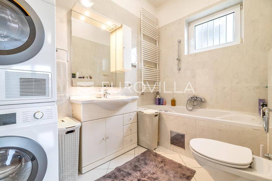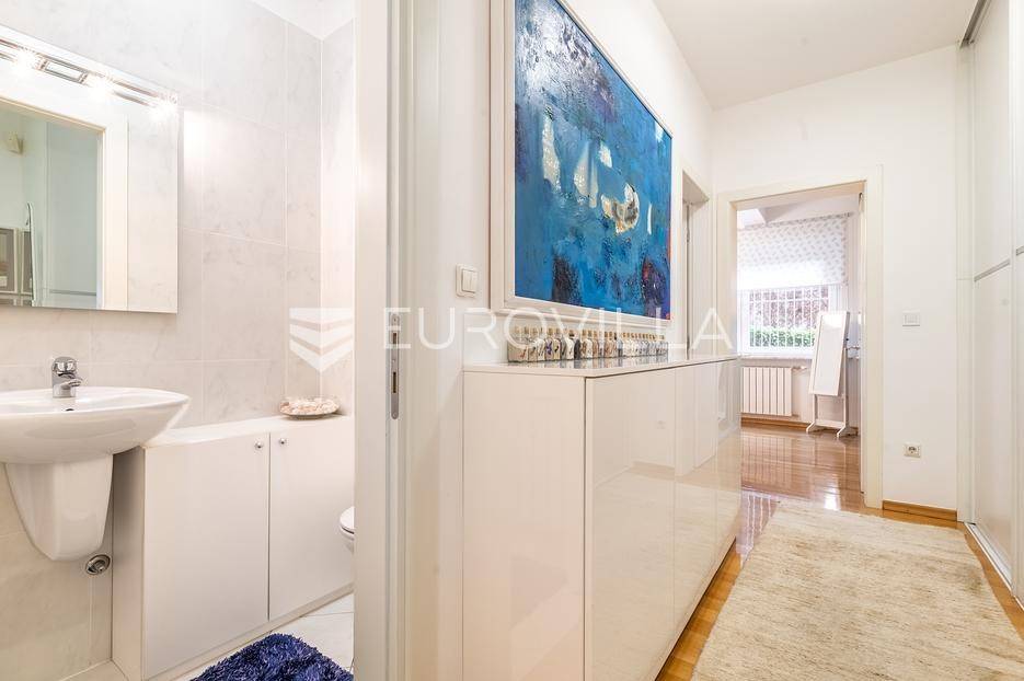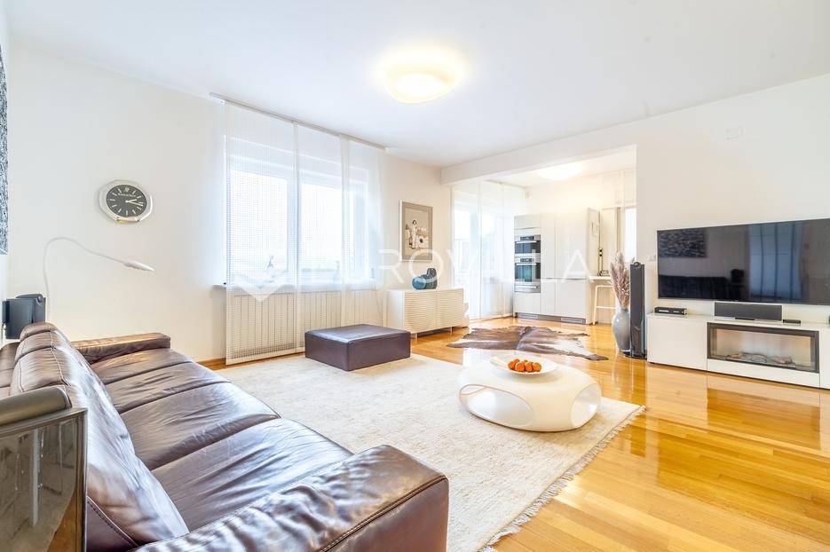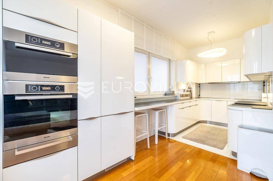 Prodaje se vrhunski luksuzan 4-sobni stan u VMD zgradi najviše kvalitete gradnje, na mirnoj i ekskluzivnoj lokaciji. Nekretnina je izuzetno očuvana, besprijekorno održavana i prodaje se u potpunosti namještena.Ukupna površina stana iznosi 145 m². Interijer je opremljen namještajem po mjeri, NOLTE kuhinjom i MIELE aparatima, što jamči visoki standard i bezvremenski luksuz.Stan ima izuzetno funkcionalan raspored: prostrani ulazni hodnik, gostinjski WC, kupaonicu, dvije spavaće sobe te izdvojenu roditeljsku spavaću sobu s vlastitom kupaonicom.Centralni dio čini veliki open space dnevni boravak s blagovaonicom i kuhinjom, s direktnim izlazom na terasu od 30 m² s otvorenim pogledom. Stanu dodatno pripada privatni vrt od 50 m².U cijenu su uključene dvije garaže, vanjsko parkirno mjesto i spremište.Orijentacija sjever-istok, etažno plinsko grijanje, klima, lift.Uredno vlasništvo i kompletna dokumentacija.Izvrsna lokacija u neposrednoj blizini škole, vrtića, trgovina i javnog gradskog prijevoza, idealna za obiteljski i urbani način života.Izvrsna gradnja renomirane firme VMD.Stojimo vam na raspolaganju za sve dodatne informacije i razgledavanje nekretnine.... Više na eurovilla.hr, ID: 975645