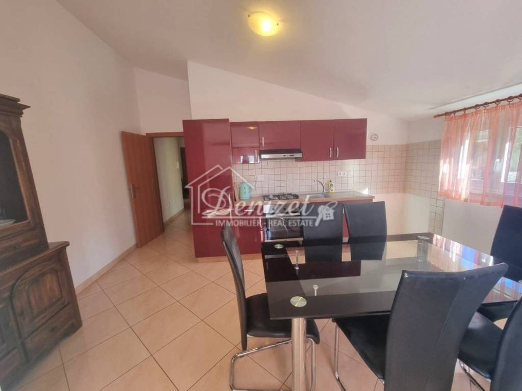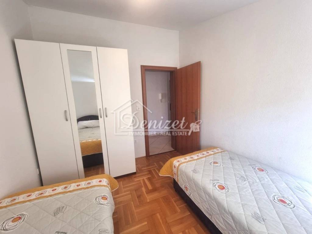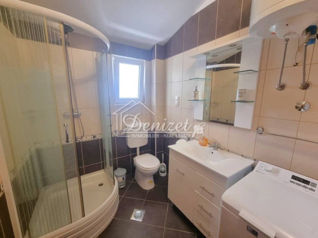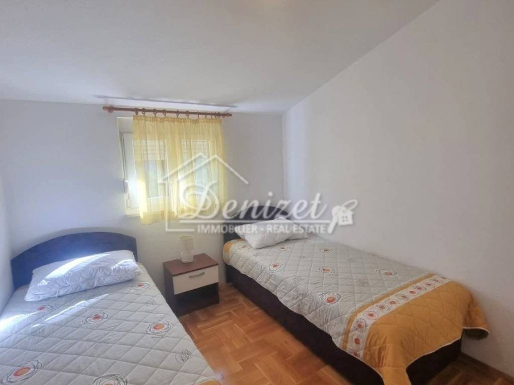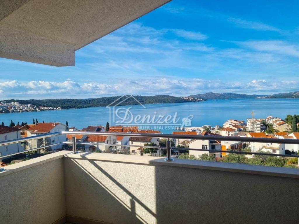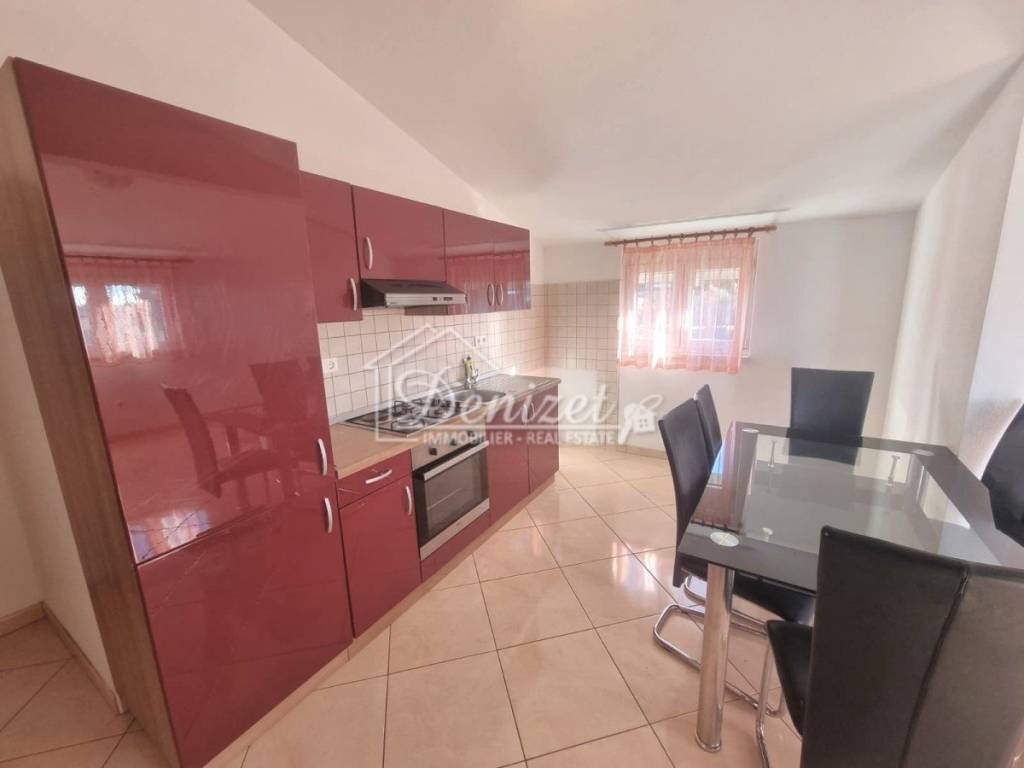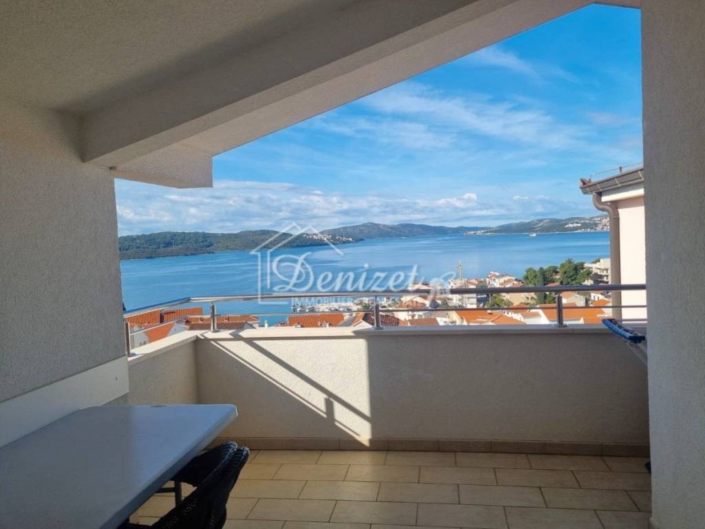 For sale is a charming apartment located in a quiet part of Okrug Gornji, in a small residential building with a total of eight units spread over four floors: ground floor, first and second floor, and attic. The apartment for sale is situated in the attic and offers a total living area of 57.32 m². It consists of a living room, kitchen with dining area, hallway, two bedrooms, and a bathroom. The living room opens onto a 9.94 m² loggia with stunning panoramic sea view, while one of the bedrooms also has its own access to a second loggia of 5.35 m².The property includes one outdoor parking space and is being sold fully furnished and equipped. Its west-facing orientation provides plenty of natural light throughout the day and spectacular sunsets. The location is extremely convenient, with all necessary amenities nearby. The sea and the main pebble beach are only 500 meters away, the center of Trogir is 2.5 km, and Split Airport is just 8 km from the property.