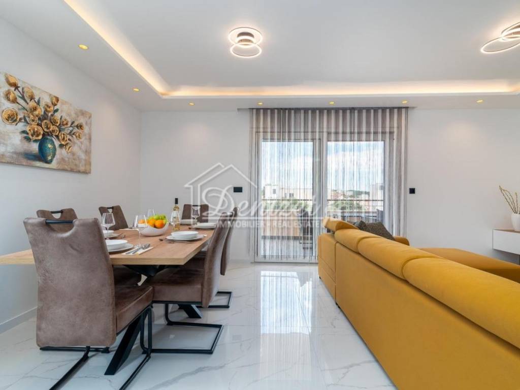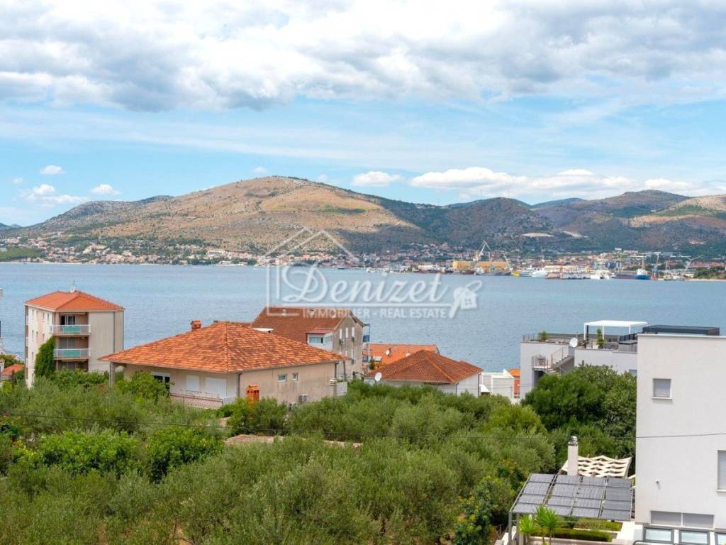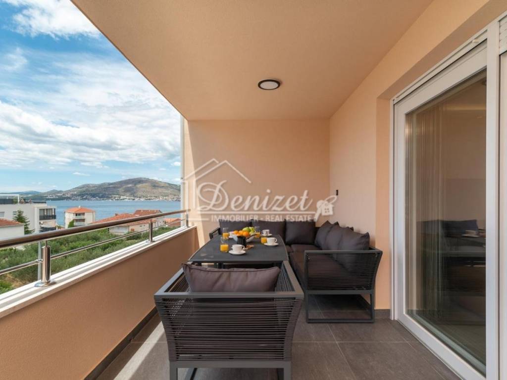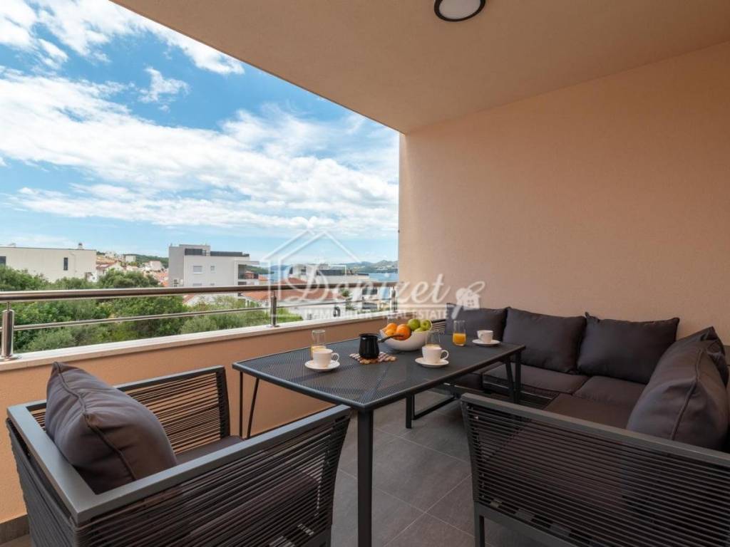 For sale is a beautiful, modern three-bedroom apartment located on the second floor of a small residential building in Okrug Gornji. The building enjoys an excellent location, just a few minutes’ walk from the sea, the beach, the town center, and all essential amenities for daily life. The apartment has a total living area of 92.79 m² and consists of a living room, kitchen, dining area, hallway, three bedrooms, and two bathrooms. It features two covered terraces with an area of 24.26 m². The living room opens onto a large terrace with stunning sea view, while two of the bedrooms have access to the second terrace. The apartment also includes one outdoor parking space. Fully renovated and furnished with modern furniture and top-quality appliances, the apartment is ready to move in. The interior is bright, airy, and warm, with a functional layout that provides a sense of spaciousness and comfort. The location is ideal: only 450 meters from the sea, the nearest beach, and the town center. Trogir is 4 km away, and Split Airport is just 9 km away, making this property perfect for permanent residence or a rental investment.