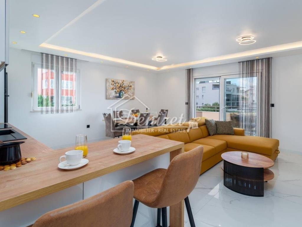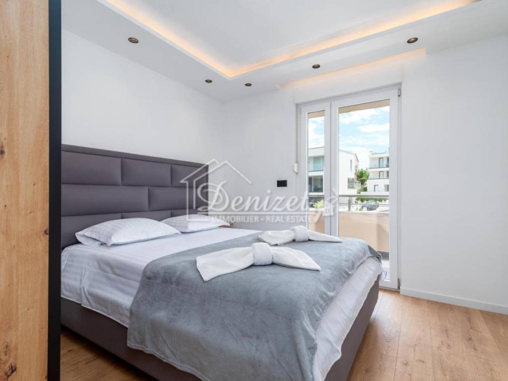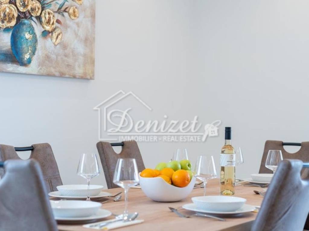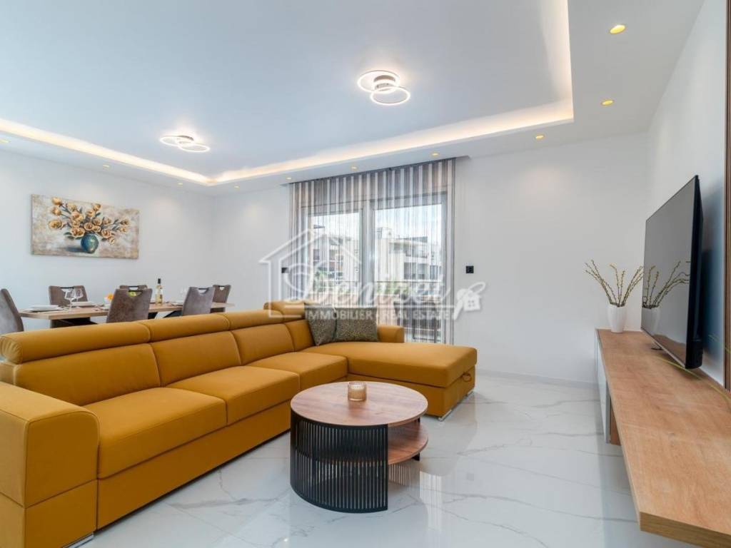 For sale is a beautiful, modern three-bedroom apartment located on the second floor of a small residential building in Okrug Gornji. The building enjoys an excellent location, just a few minutes’ walk from the sea, the beach, the town center, and all essential amenities for daily life. The apartment has a total living area of 92.79 m² and consists of a living room, kitchen, dining area, hallway, three bedrooms, and two bathrooms. It features two covered terraces with an area of 24.26 m². The living room opens onto a large terrace with stunning sea view, while two of the bedrooms have access to the second terrace. The apartment also includes one outdoor parking space. Fully renovated and furnished with modern furniture and top-quality appliances, the apartment is ready to move in. The interior is bright, airy, and warm, with a functional layout that provides a sense of spaciousness and comfort. The location is ideal: only 450 meters from the sea, the nearest beach, and the town center. Trogir is 4 km away, and Split Airport is just 9 km away, making this property perfect for permanent residence or a rental investment.