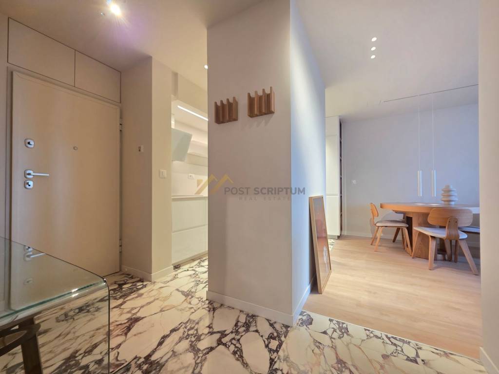 Sastoji se od ulaznog dijela s toaletom, kuhinje s blagovaonicom i dnevnim dijelom s izlazom na lođu, tri spavaće sobe (jedna bračna i dvije manje), ostave s perilicom i sušilicom rublja, kupaonice i lođe s koje se pruža pogled na more.