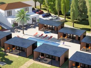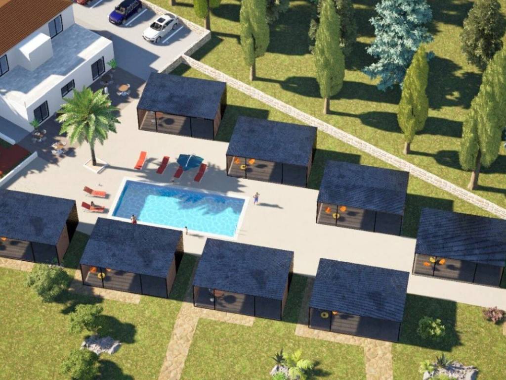 The houses in question are planned to be placed around a 12 m x 6 m pool with 240 m2 of paved beach around the pool. The entire property will be surrounded by a fence, next to which Mediterranean plants will be planted (rosemary, lavender), in order to provide maximum privacy and an authentic Dalmatian atmosphere to the camps users. On the field there is also a well with a water source, 4 pillars on which there will be security cameras that will cover the entire camp, and enable Starlink wi-fi connection for all users, and a septic bio-purifier with a capacity for 60 people that covers the needs of the entire camp and from home. Only 150 meters from the camp is a beach with healing mud that fits perfectly into the whole idea of a glamping resort.