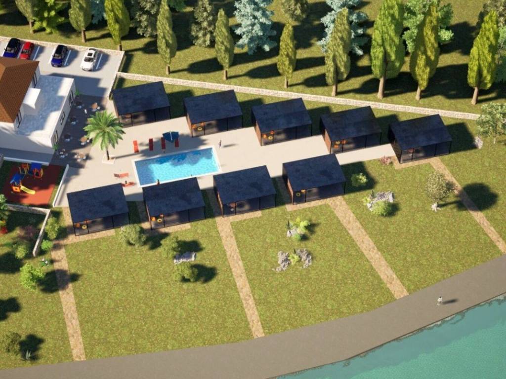 a camp of 9 modern modular houses of 23 m2 (two bedrooms, kitchen, bathroom), each with an associated covered terrace of 30 m2, located in the first row by the sea with a view of the Velebit mountain.