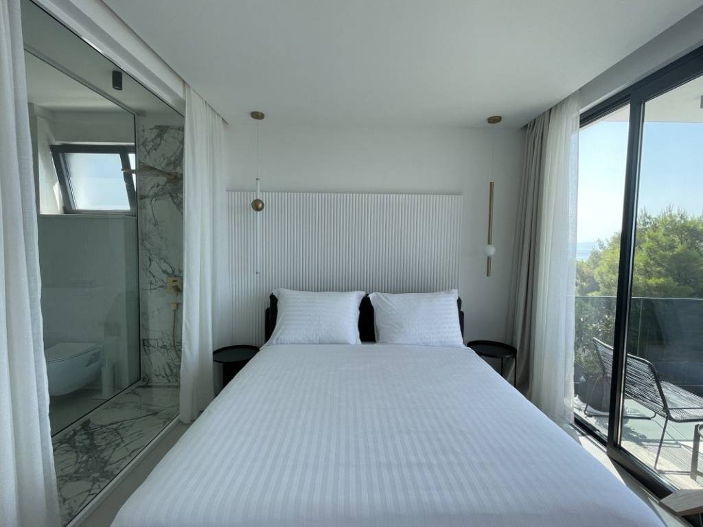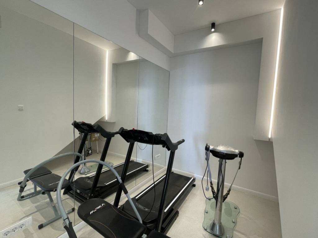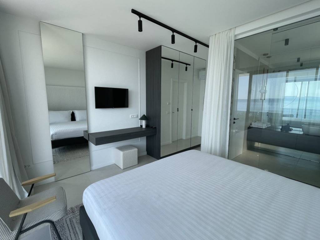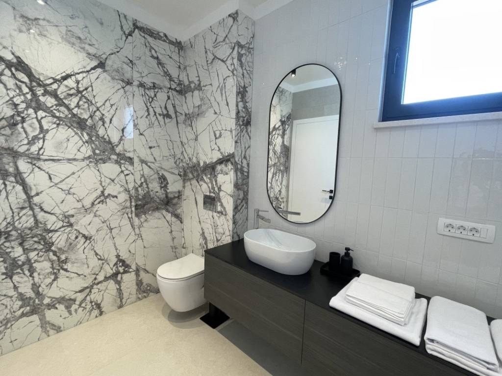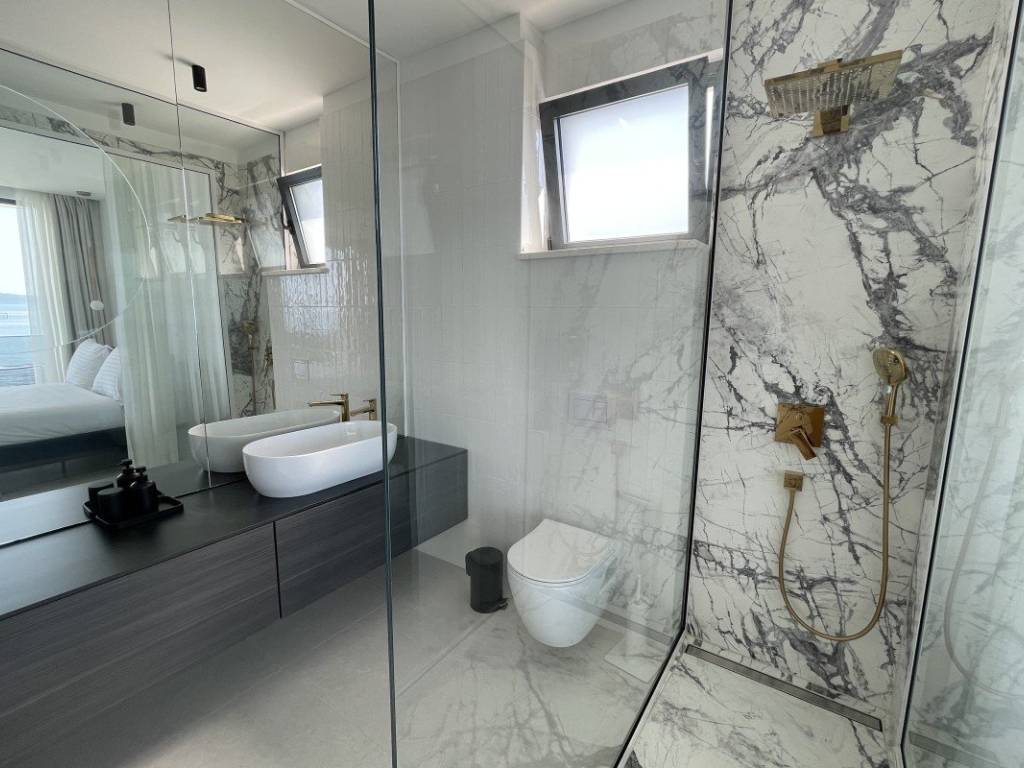 On the ground floor there is a living area consisting of a kitchen, dining room and living room with a view of the sea and access to an uncovered terrace. On the same floor there is also a gym and one bedroom with a private bathroom. An internal staircase leads to the mezzanine where there is a toilet, laundry room and technical room. On the first floor there are three more bedrooms with private bathrooms, two of which have access to a covered balcony. A special detail is the glass wall in the bathroom belonging to the master bedroom, which offers a beautiful view of the sea. On the top floor there is a bedroom with a private bathroom and a walk-in closet and a mini bar with access to a spacious terrace with a hot tub.