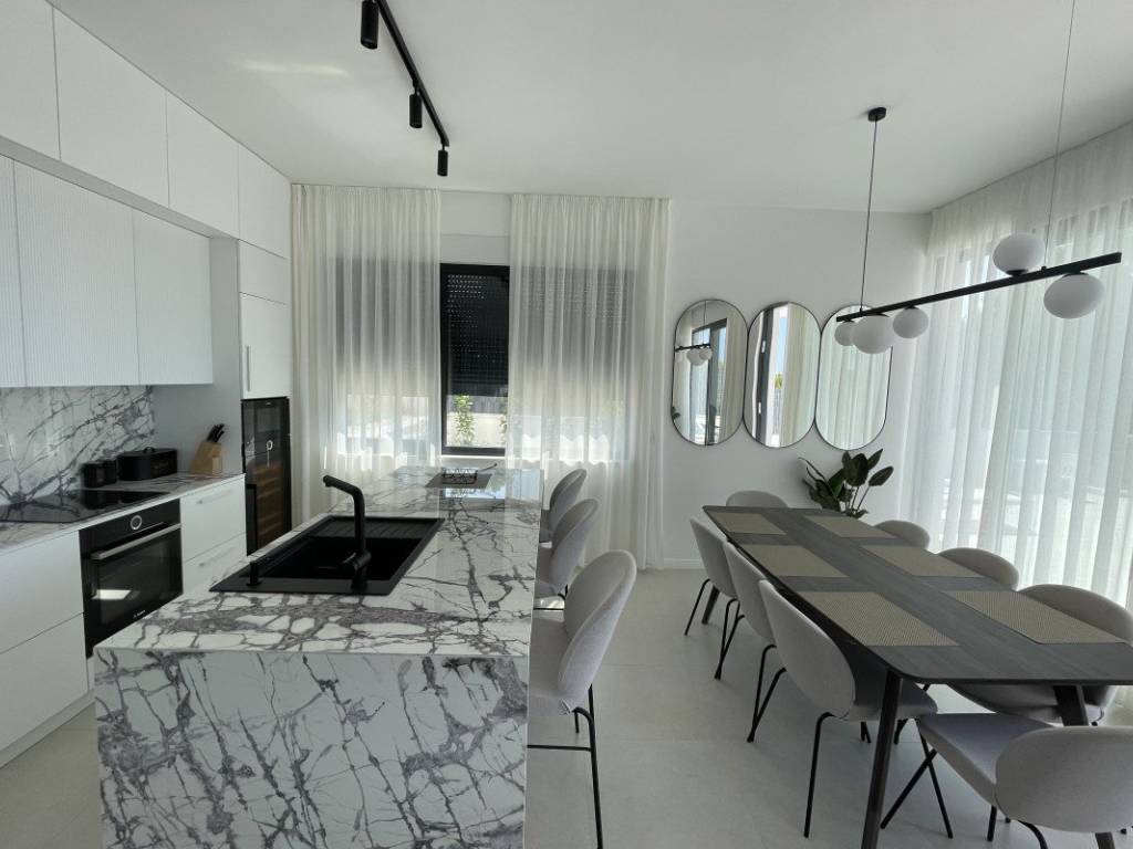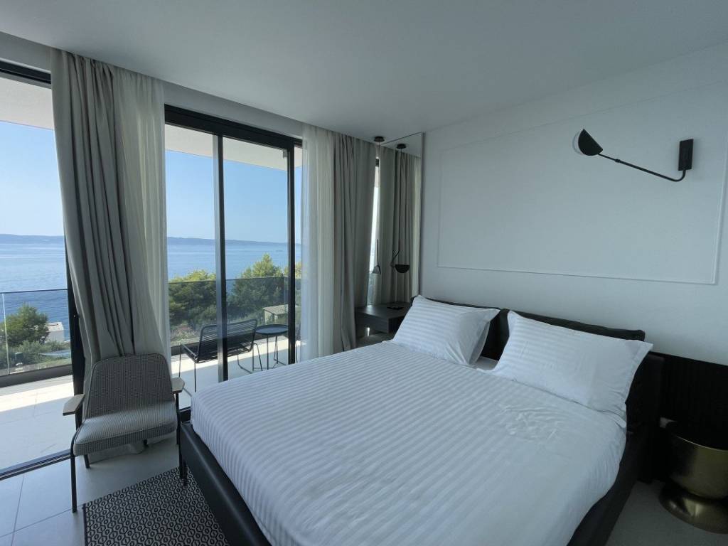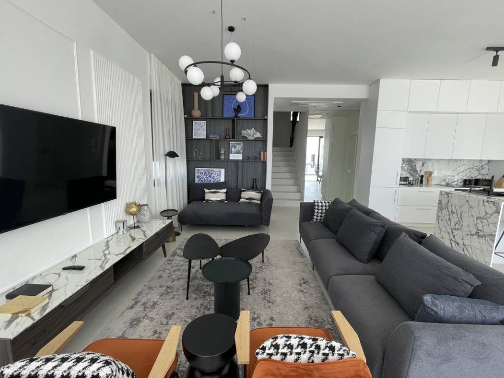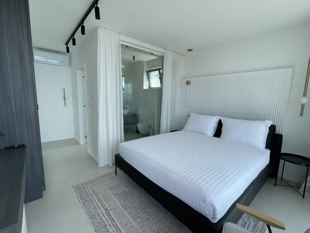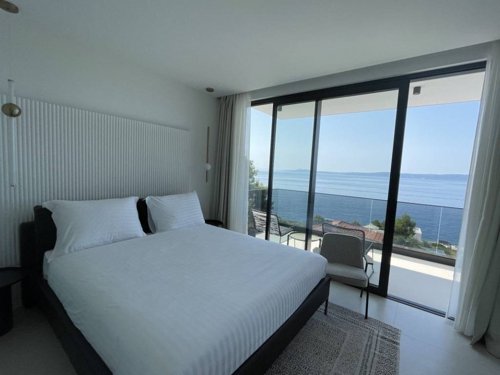 On the ground floor there is a living area consisting of a kitchen, dining room and living room with a view of the sea and access to an uncovered terrace. On the same floor there is also a gym and one bedroom with a private bathroom. An internal staircase leads to the mezzanine where there is a toilet, laundry room and technical room. On the first floor there are three more bedrooms with private bathrooms, two of which have access to a covered balcony. A special detail is the glass wall in the bathroom belonging to the master bedroom, which offers a beautiful view of the sea. On the top floor there is a bedroom with a private bathroom and a walk-in closet and a mini bar with access to a spacious terrace with a hot tub.