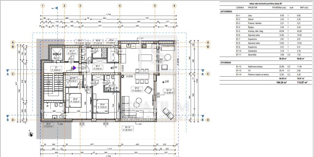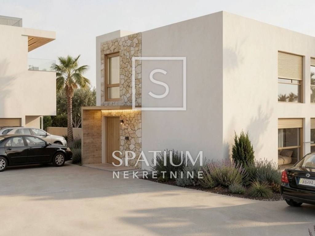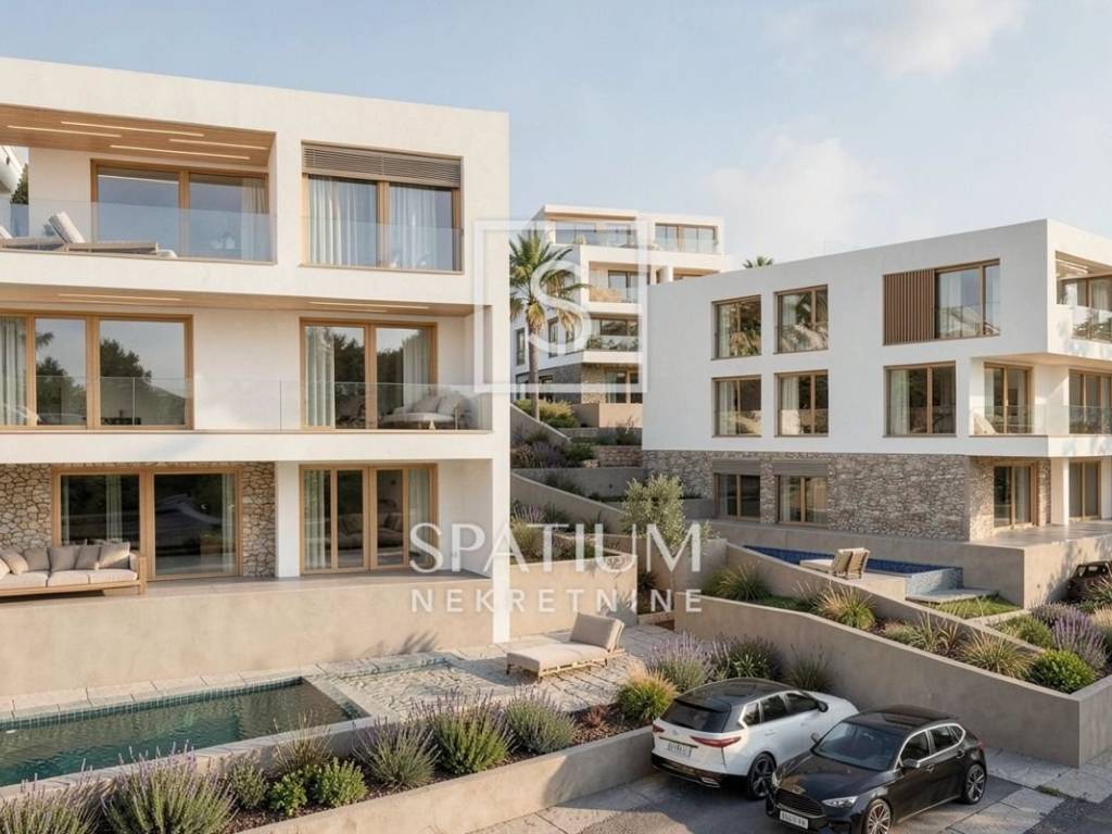 LOVRAN, we offer a two-bedroom apartment on the high ground floor of a new building with a shared swimming pool. The apartment covers the entire floor and has an excellent floor plan. The entrance hall has space for a built-in wardrobe. On the north side there is a guest toilet and a technical room with a laundry room. On the opposite, south side there are two bedrooms with private bathrooms, which contributes to a high level of comfort. The bedrooms, measuring 13 to 14 square meters, have plenty of natural light thanks to their southern orientation and large glass surfaces. The ground floor apartment has its own part of the garden that can be accessed from the bedrooms and from the terrace. The master bedroom has the additional benefit of a separate wardrobe. At the end of the entrance hall there is the main living room, measuring 43 square meters, which combines the functions of a kitchen, dining room and living room with access to a covered terrace with a sea view.