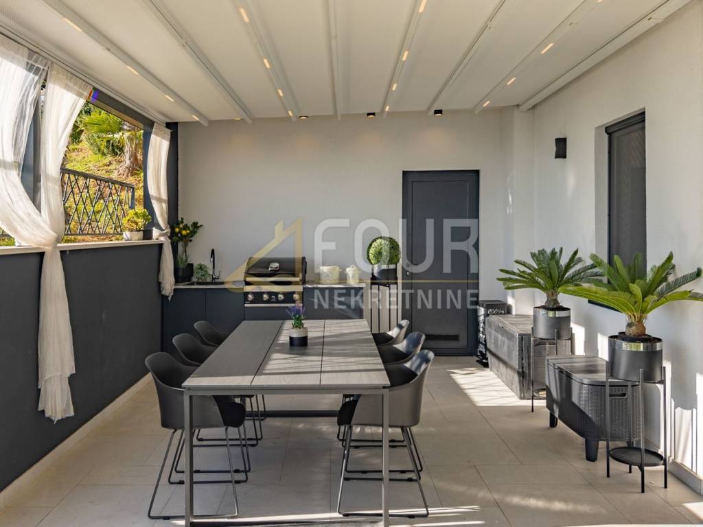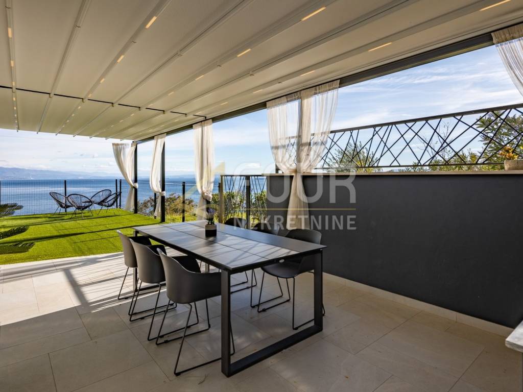 The residential area on the high ground floor is designed as a representative space for living and socializing, with a spacious living room connected to the kitchen and dining room that lead to a large terrace with panoramic sea views. The covered terrace is equipped with automated pergolas and a summer kitchen, creating a perfect environment for outdoor living throughout the year.