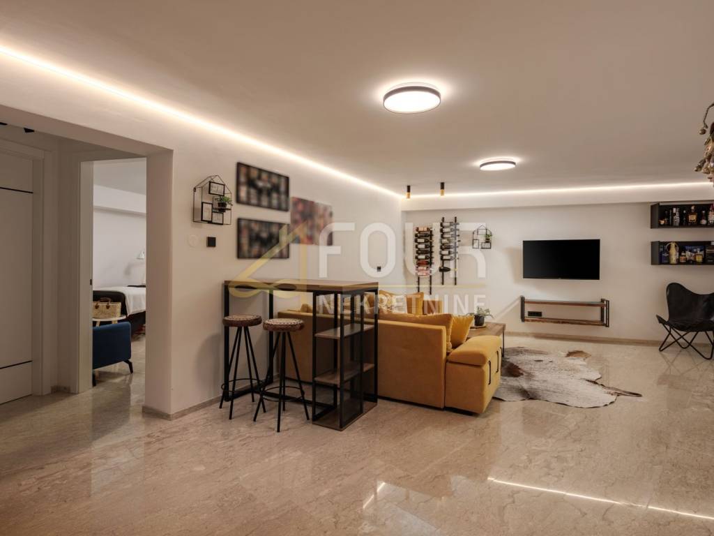 The apartment has four bedrooms, including a master bedroom with its own bathroom, additional elegantly designed bathrooms, an office with an integrated wine bar and billiard space, and a separate technical room.