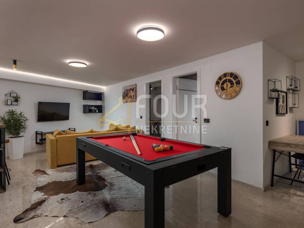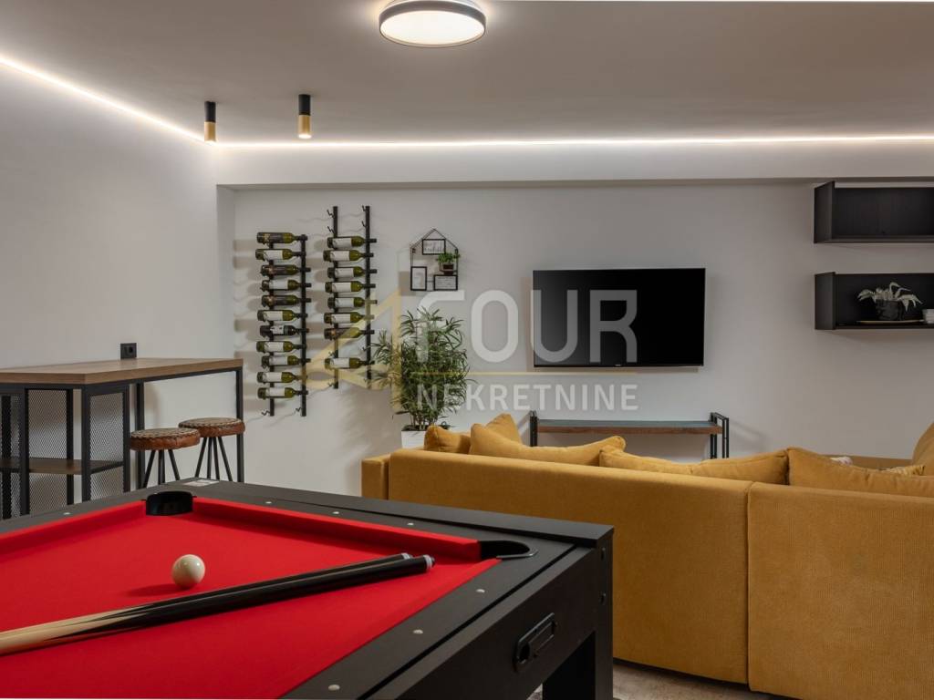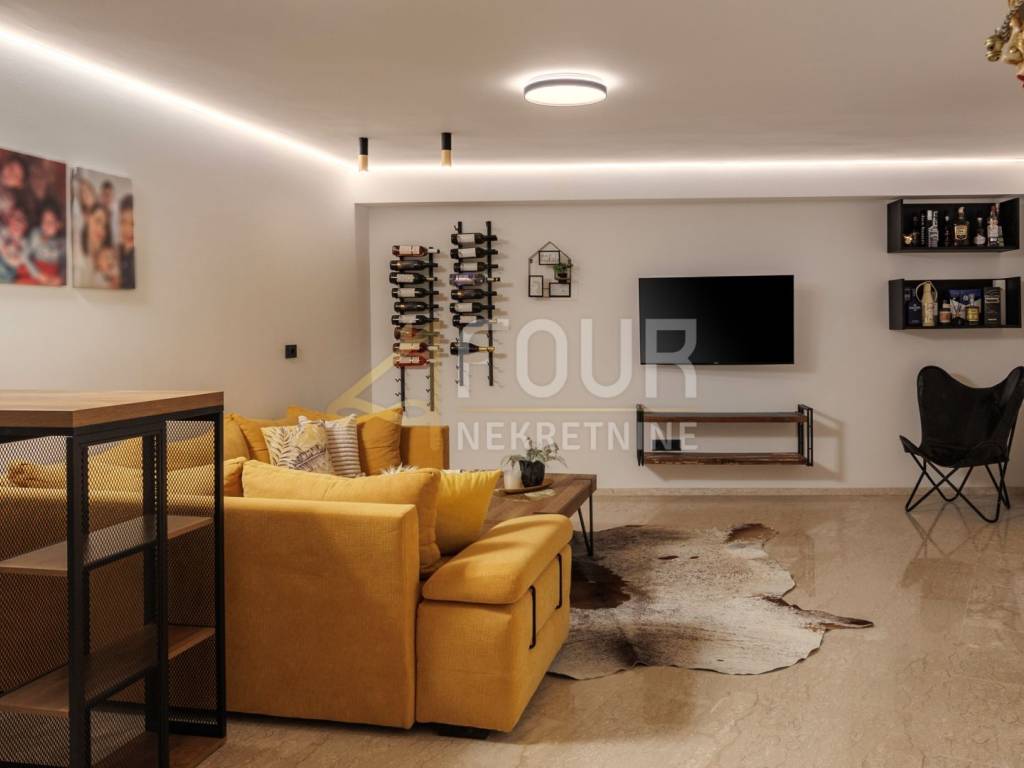 The basement area, which according to the floor plan includes a tavern, recreational space, and storage, is fully furnished as a separate functional unit and used as an apartment. It is equipped with high-quality materials, including Italian ceramics and underfloor heating, and offers additional space for relaxation and socializing.