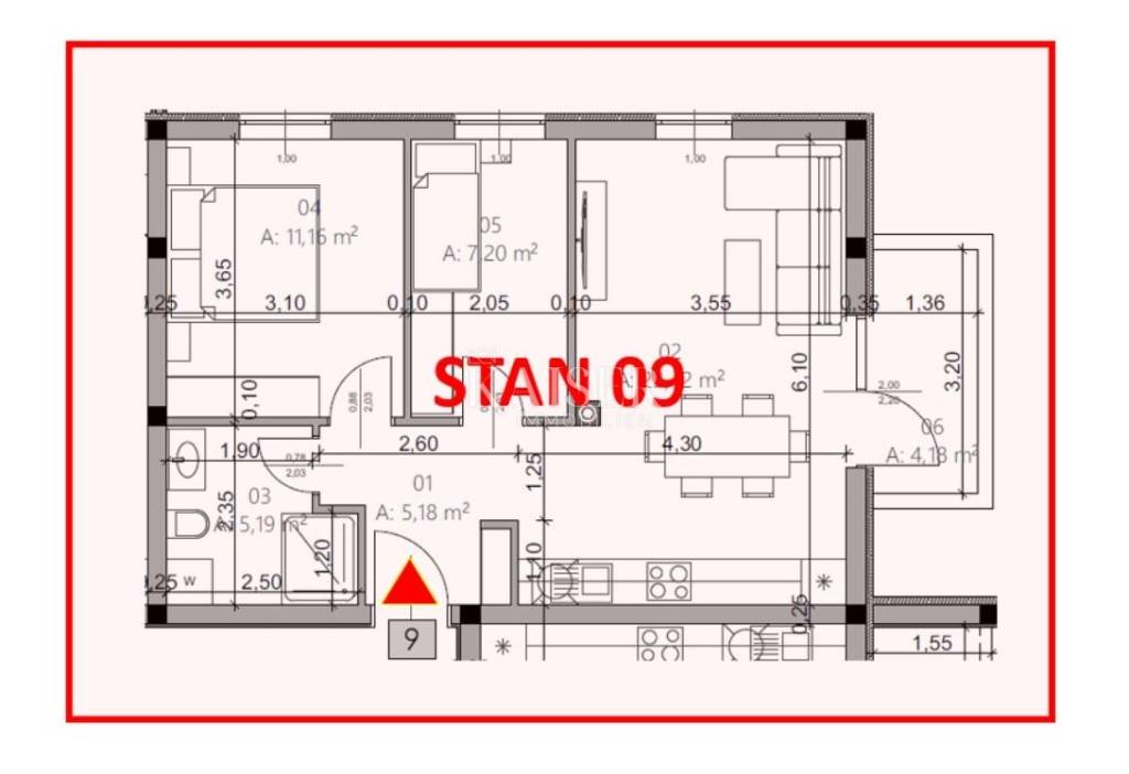 On the first floor of this modern building there is a two-bedroom apartment with a total area of 54.24 m², carefully designed to provide maximum functionality and a pleasant layout. Upon entering the apartment, you will arrive at the entrance area of 5.18 m², which provides enough space for a wardrobe and leads to all rooms of the apartment. The central part of the apartment is a bright and pleasant living area of 23.42 m², which combines the kitchen, dining room and living room, creating an open concept ideal for everyday life and socializing. The living room opens onto a 4.18 m² balcony, which provides additional space for outdoor relaxation. The apartment has two bedrooms, the larger one measuring 11.16 m² and a smaller room measuring 7.20 m², which can be used as a children's room, guest room or work area. The bathroom measuring 5.19 m² is functionally located near the bedrooms and provides enough space for comfortable everyday use. The apartment is oriented to the northeast, which ensures a pleasant temperature during the warmer months and a peaceful atmosphere for everyday life.