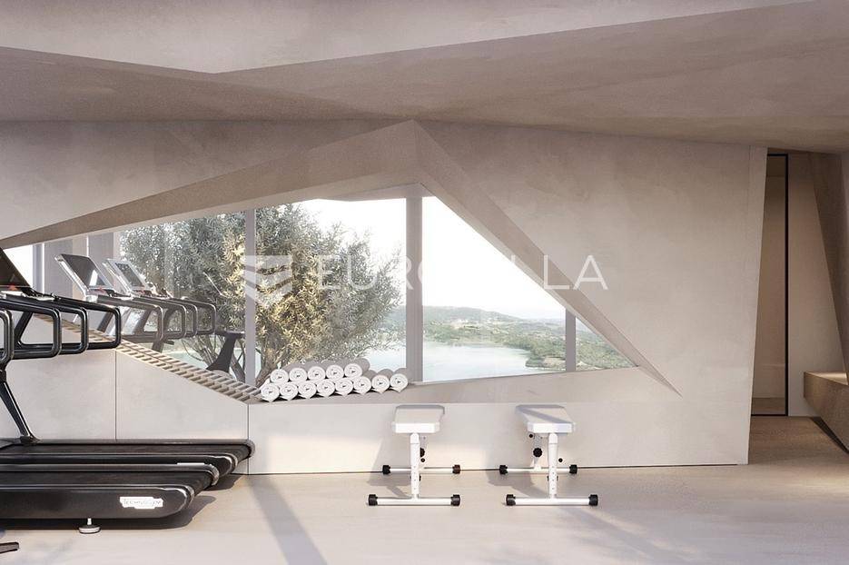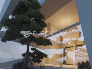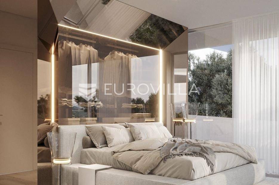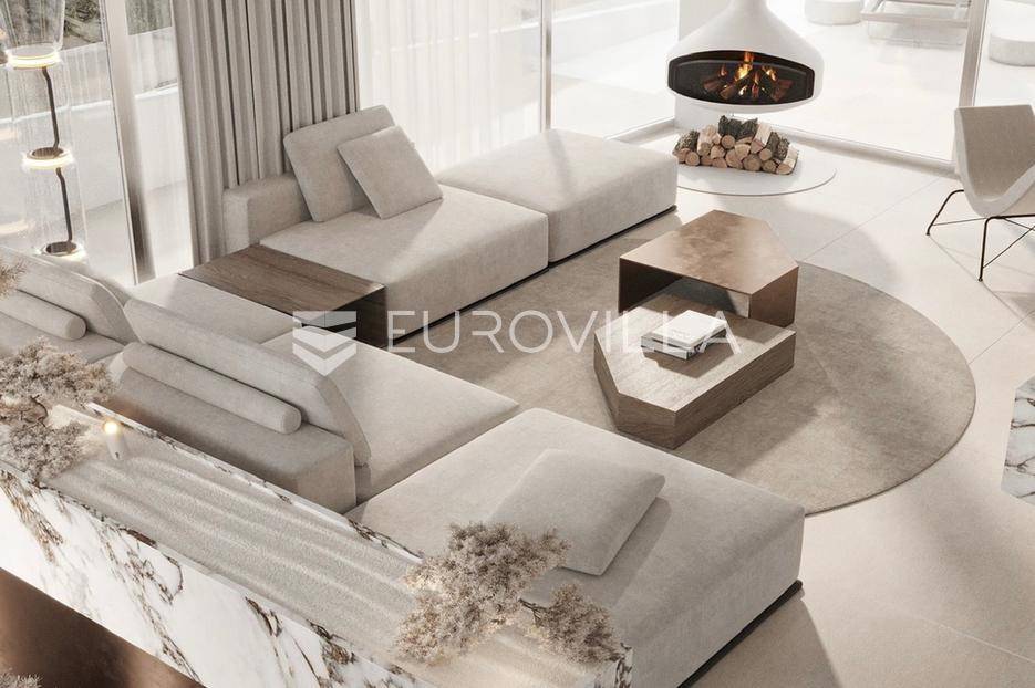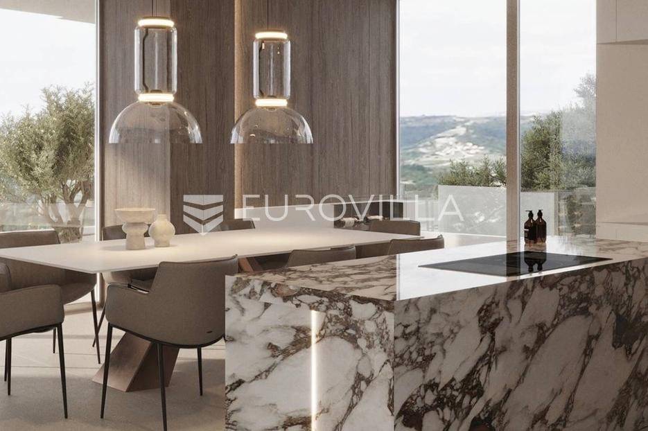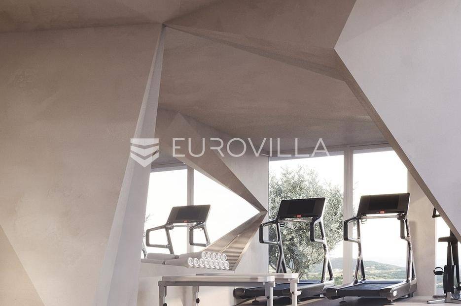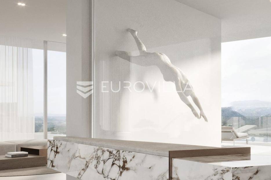 Smještena na uzvišenom i mirnom mjestu u okolici Labina, ova suvremena dizajnerska vila u izgradnji predstavlja vrhunac luksuza. S panoramskim pogledom na more i otoke, nudi jedinstvenu priliku za posjedovanje nekretnine koja spaja sofisticirani dizajn s najvišim standardima kvalitete.Vila ukupne površine 577 m² obuhvaća 314 m² unutarnjeg prostora, 197 m² terasa, krovni bazen od 34 m² te garažu od 32 m². S četiri spavaće sobe i četiri luksuzno opremljene kupaonice, s dizajnerskim sanitarijama u brušenoj bronci i satenskoj završnoj obradi, pruža iznimnu udobnost i suvremenu estetiku. Interijer od 314 m² zamišljen je kao fluidan, moderan životni prostor.Gornji kat posvećen je ulaznom prostoru, wc-u, otvorenom konceptu dnevnog boravka s kuhinjom i blagovaonicom, s izravnim pristupom prostranoj terasi i krovnom bazenu. Terasa je djelomično natkrivena, gdje se smjestila i ljetna kuhinja, a djelomično nenatkrivena gdje se smjestilo sunčalište. Stepenicama se spuštamo na donju etažu gdje se smjestila prostrana spavaća soba, kupaonica, prostrana natkrivena terasa, teretana, sauna te pristup dvama garažnim parkirnim mjestima. Ponovno se stepenicama spuštamo na etažu gdje je naglasak na prostranu master spavaću sobu od 31.50 m2 s kupaonicom od 18 m2 te izlazom na nenatkrivenu terasu. Tu se nalazi i druga spavaća soba s kupaonicom i također izlazom na natkrivenu terasu, vešeraj i tehnička soba.Skulpturalni bijeli kamin Ergofocus dodaje profinjenu žarišnu točku. Arhitektonski izričaj karakteriziraju čiste horizontalne linije i prostrane staklene površine s Schüco aluminijskim sustavima, brišući granicu između interijera i eksterijera. Vrhunska keramika i pažljivo odabrani materijali osiguravaju izdržljivost, eleganciju i bezvremensku privlačnost.Cjelogodišnja udobnost osigurana je podnim grijanjem na toplinsku pumpu (uključujući garažu) te sustavom hlađenja. Krovni bazen opremljen je sustavima grijanja/hlađenja, automatskim doziranjem i pripremom za protustrujno plivanje.Nekretnina je u izgradnji, s planiranim završetkom u drugoj polovici 2026. godine. Vlasnik je pravna osoba i na navedenu cijenu se obračunava PDV.Njezina odlična lokacija nedaleko Labina garantira mir i neometan panoramski pogled na more, uz laku dostupnost obale.Za dogovor oko razgledavanja ovom velebnog izdanja, slobodno nas kontaktirajte, stojimo Vam na raspolaganju.... Više na eurovilla.hr, ID: 156366