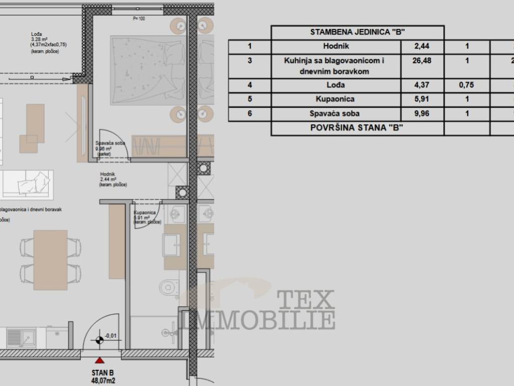 The apartment consists of a living room with kitchen and dining area (26.48 m²), one bedroom, a bathroom, and a loggia.