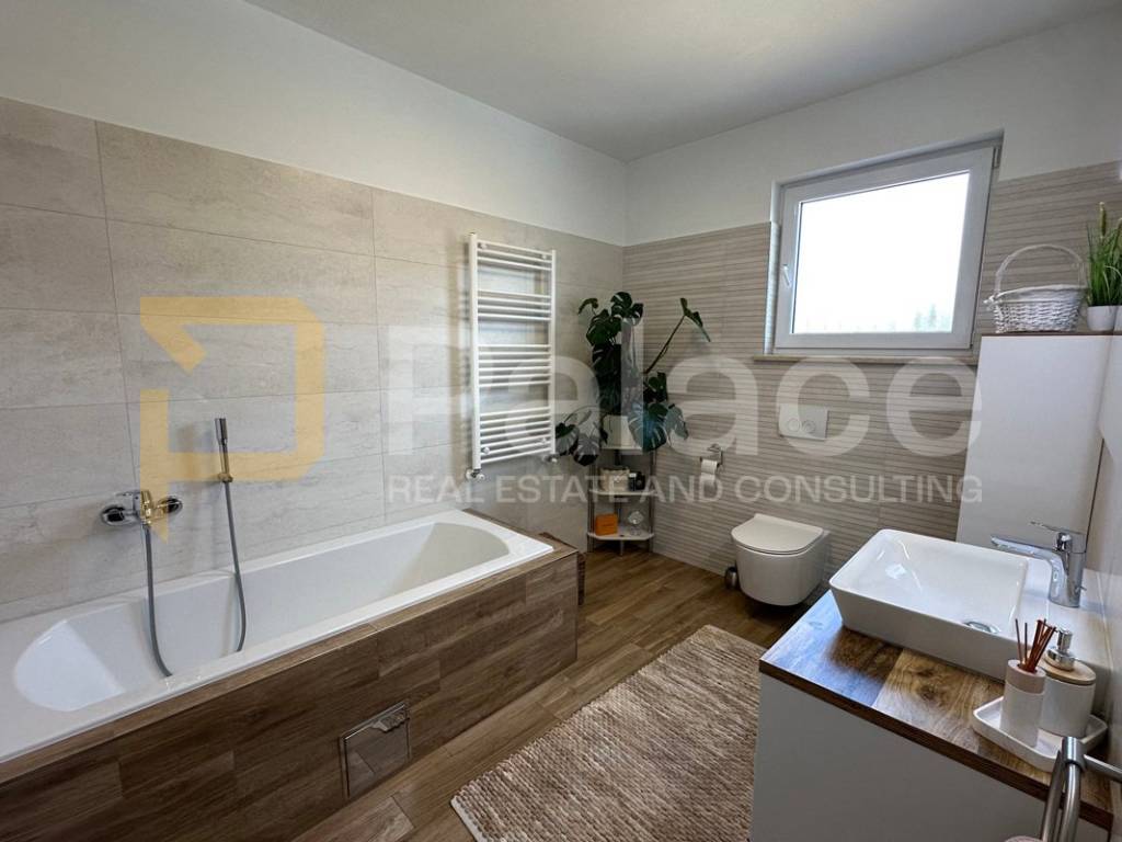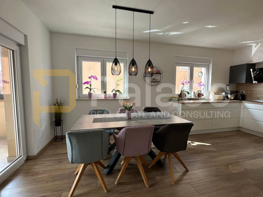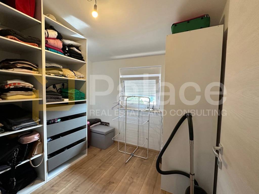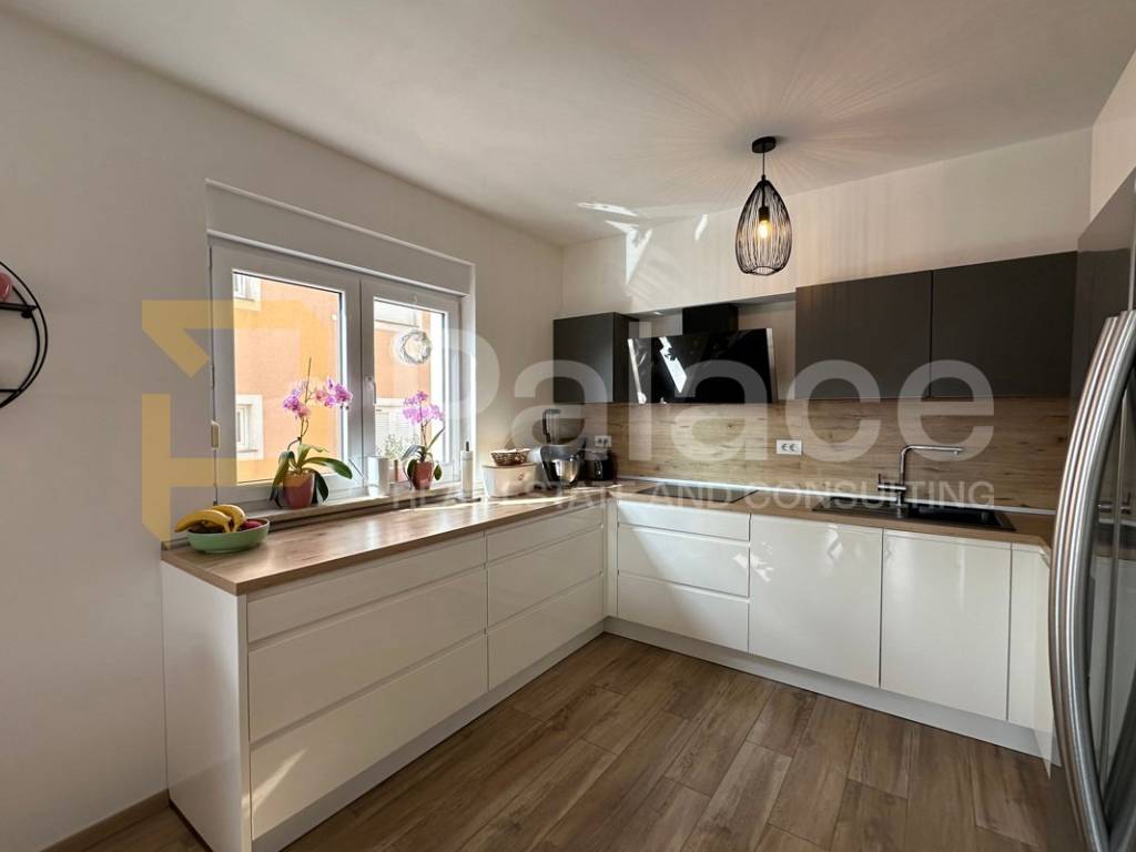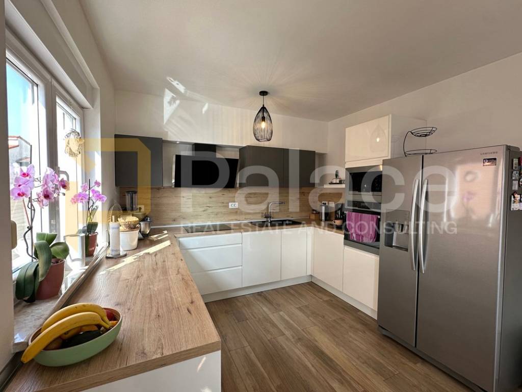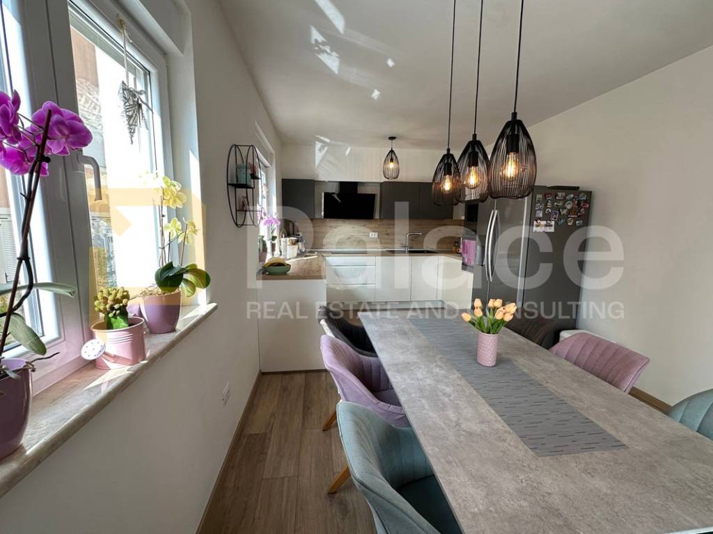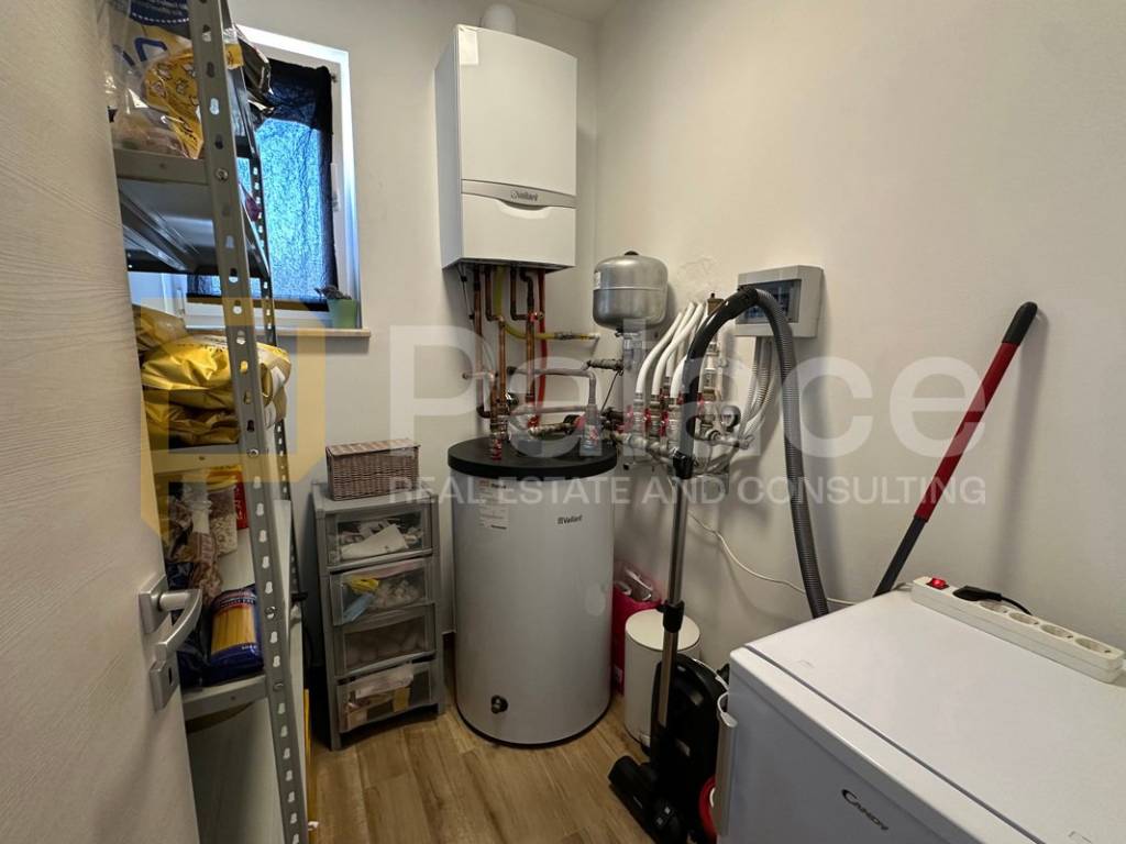 On the first floor, there is a spacious open-concept living area bathed in natural light coming from three sides. Here, the living room, custom-made kitchen, and dining area are harmoniously connected, creating an ideal space for family gatherings and relaxation. The living area opens onto a terrace that further expands the living space. The same floor also features a main bathroom with a bathtub, as well as a separate boiler room housing the boiler and a system for regulating water underfloor heating. The underfloor heating runs throughout the entire apartment, each room has its own thermostat, and this system ensures a comfortable temperature with low utility costs.