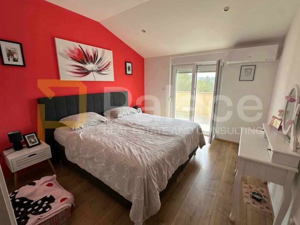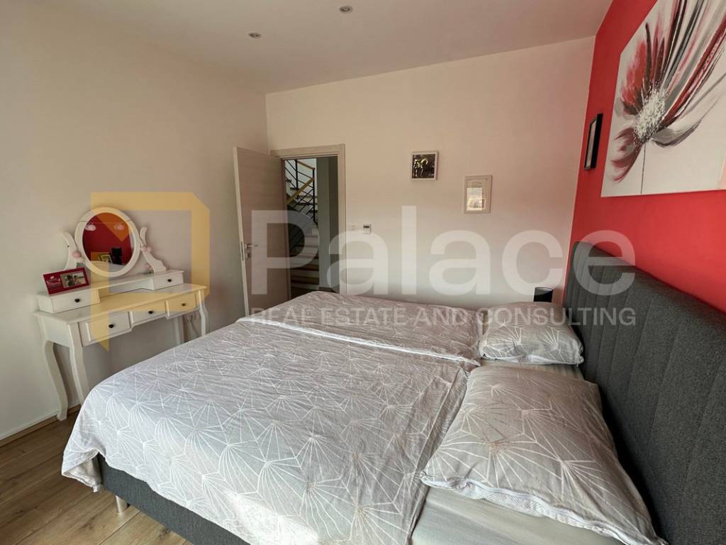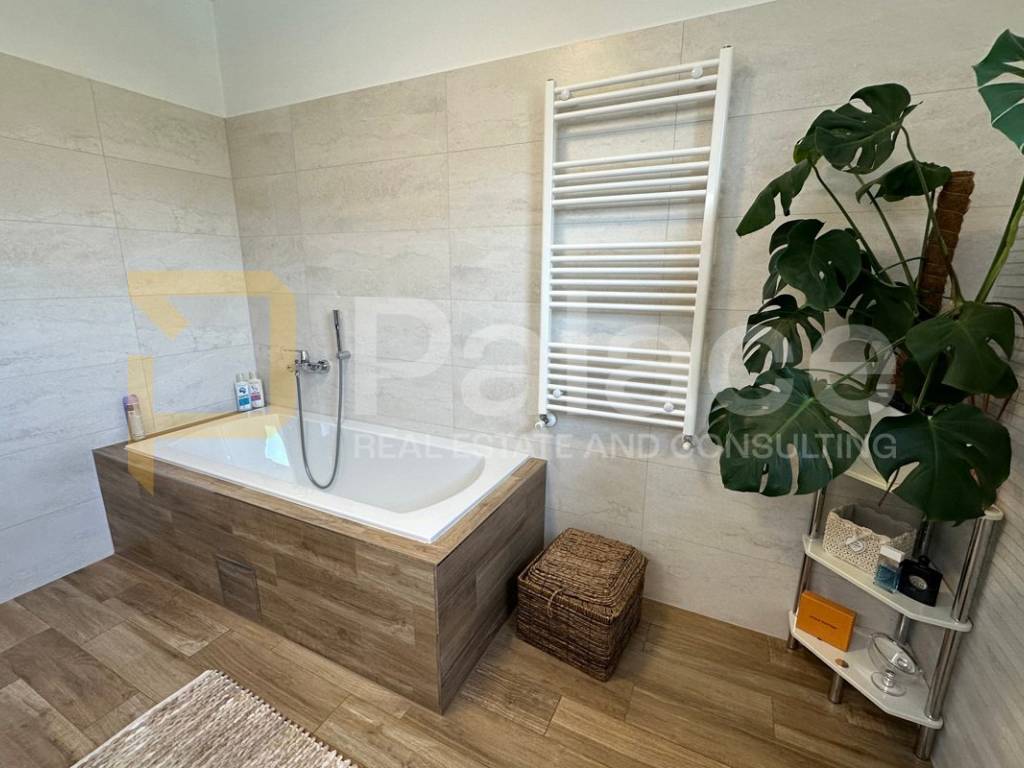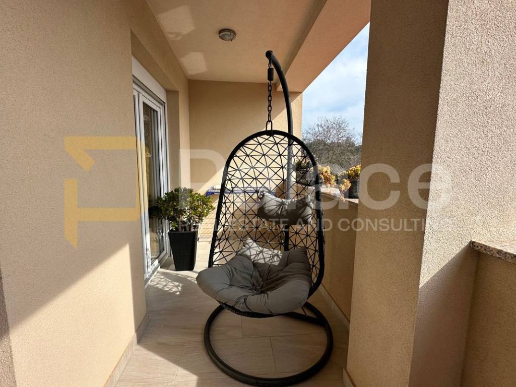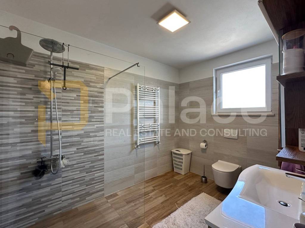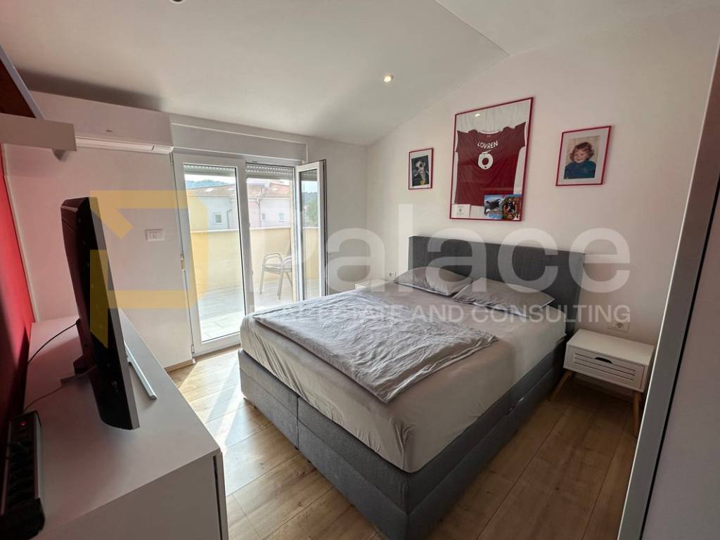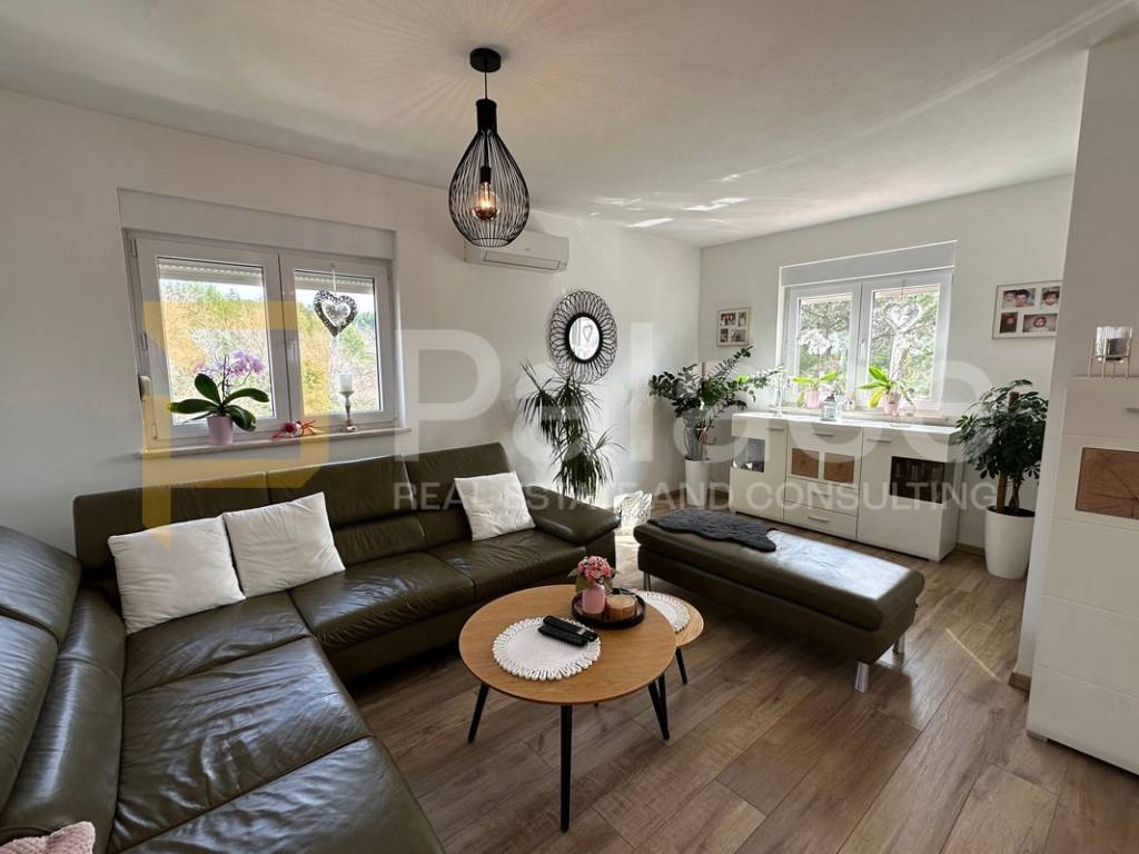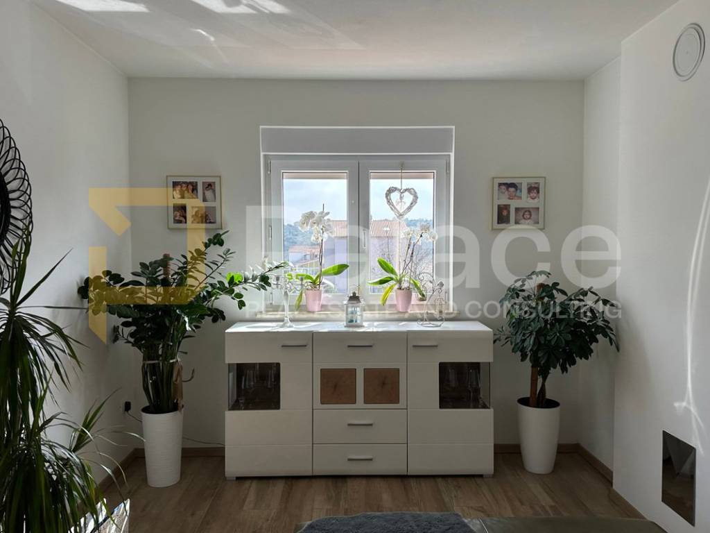 On the first floor, there is a spacious open-concept living area bathed in natural light coming from three sides. Here, the living room, custom-made kitchen, and dining area are harmoniously connected, creating an ideal space for family gatherings and relaxation. The living area opens onto a terrace that further expands the living space. The same floor also features a main bathroom with a bathtub, as well as a separate boiler room housing the boiler and a system for regulating water underfloor heating. The underfloor heating runs throughout the entire apartment, each room has its own thermostat, and this system ensures a comfortable temperature with low utility costs.