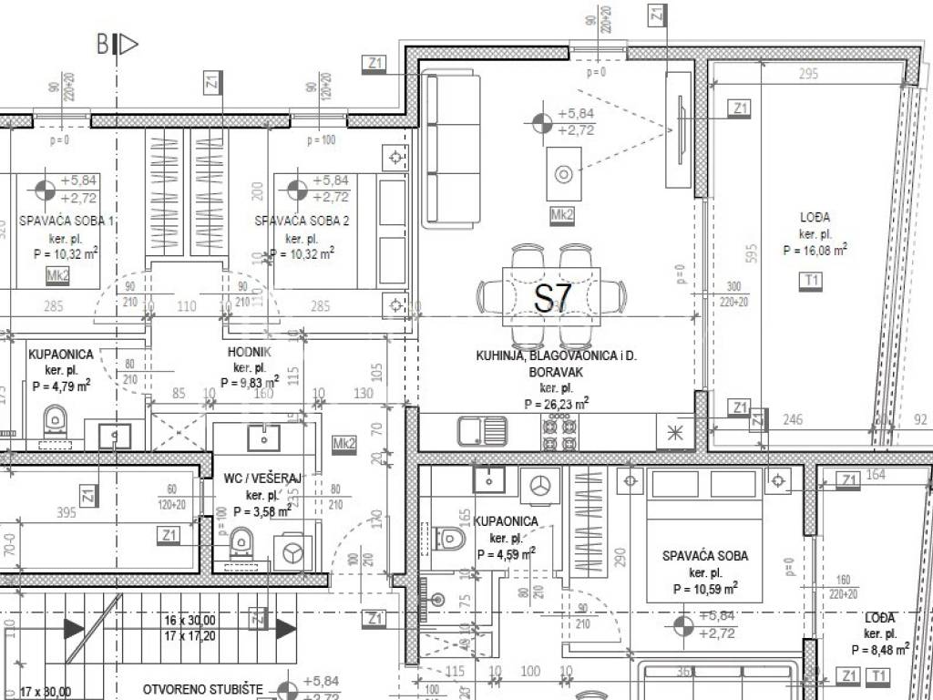 Dvosoban stan oznake S7 na 2. katu, s krovnom terasom, a sadrži: ulaz (3.20 m2), hodnik (6.00 m2), dnevni boravak s blagovaonicom i kuhinjom (25.50 m2), dvije spavaće sobe (10.10 m2 i 10.10 m2), kupaonicu (4.80 m2), WC/praonicu (3.50 m2) i lođu (19.50 m2). Ukupna stambena površina iznosi 77.83 m2. Stanu pripada vlastita krovna terasa površine 86,50 m2.