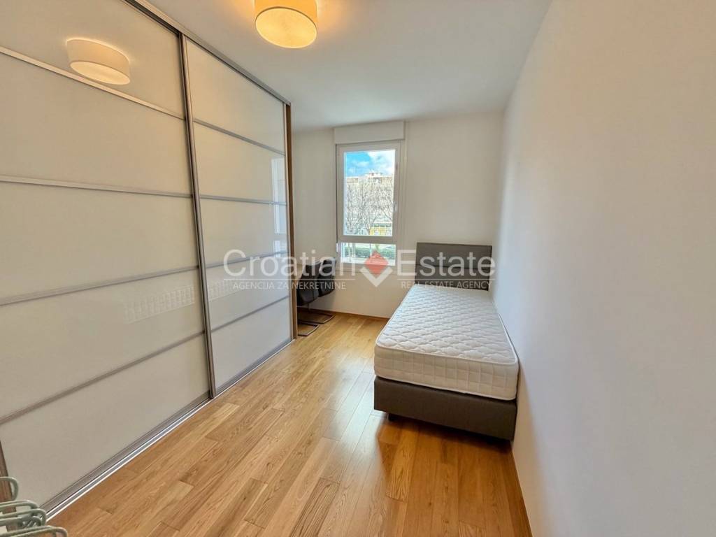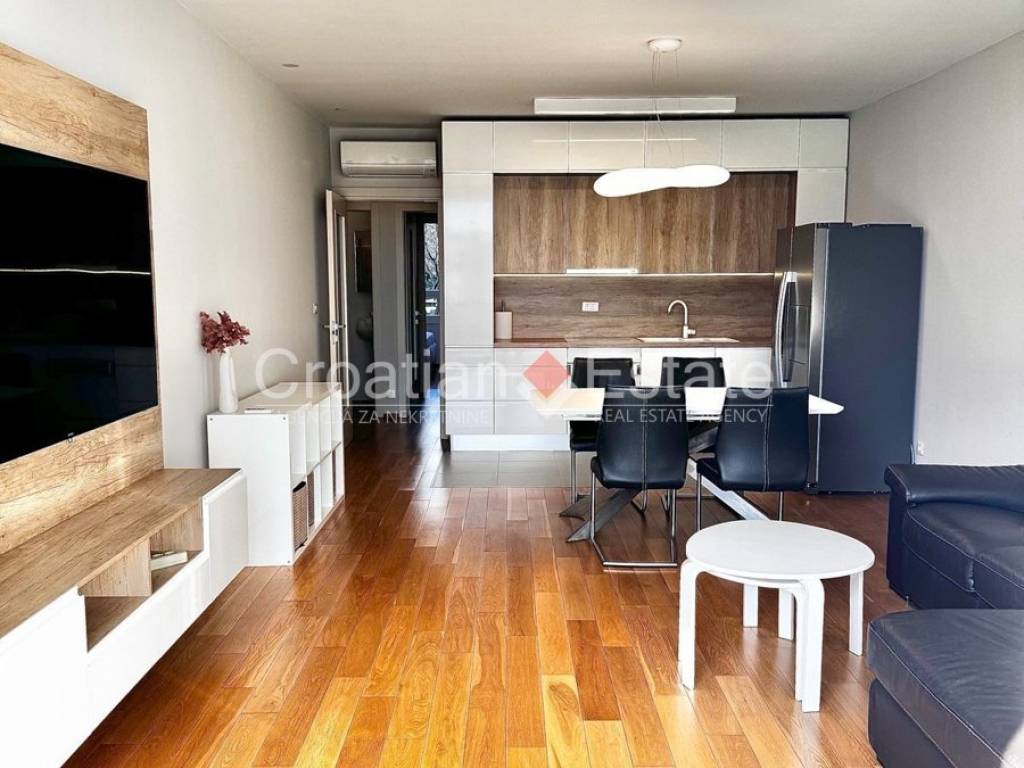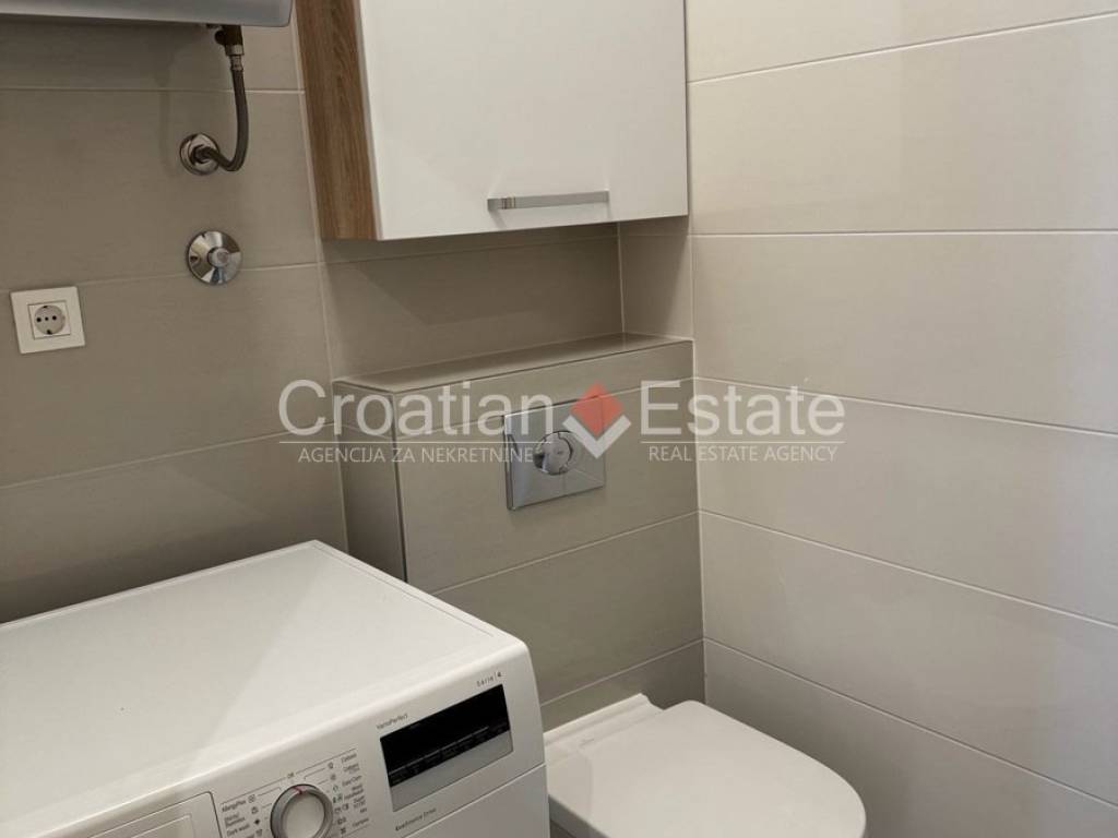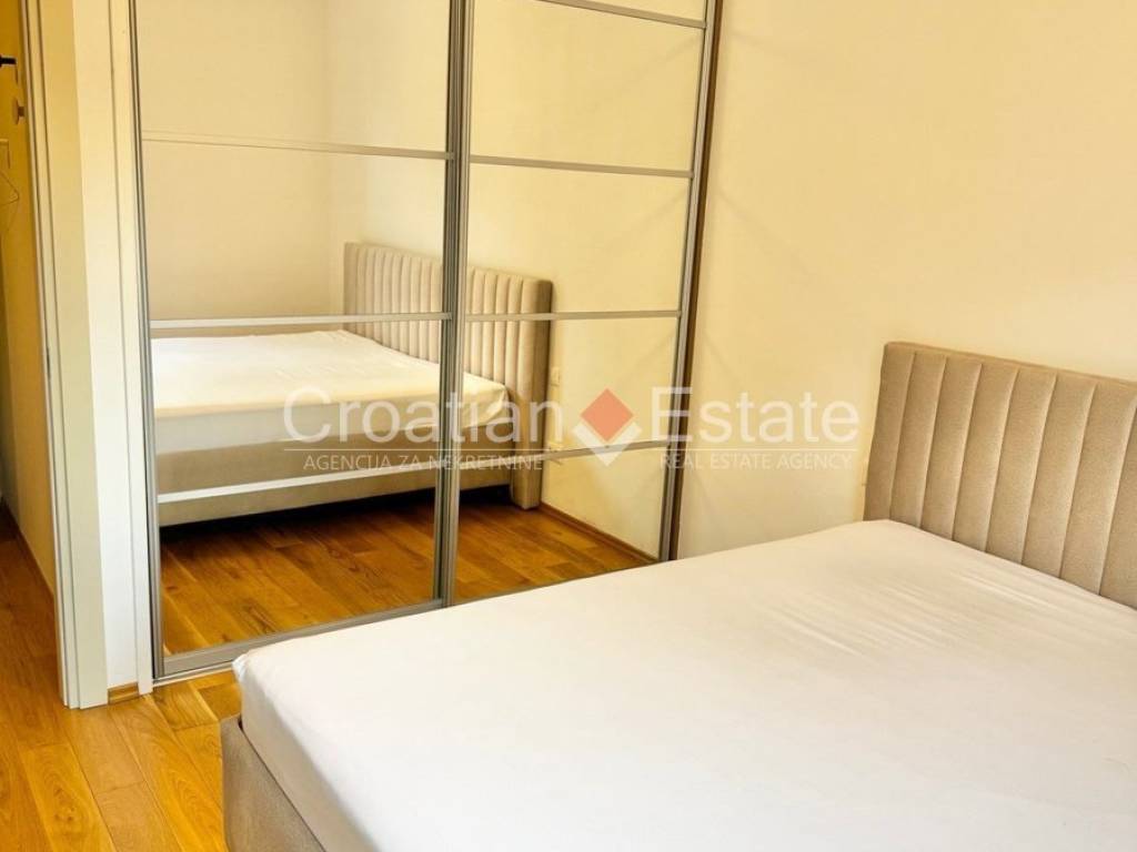 We are renting out a fully furnished and equipped, two-bedroom, south-facing flat located on the first floor of a newly built building. The living area of the flat is 76m2, and it consists of an entrance hall, a kitchen with a dining area and a living room, two bedrooms, a bathroom, a toilet, and an enclosed loggia.