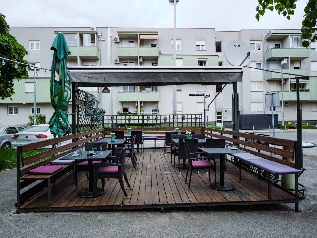 Terasa: smještena je odmah pored ulaza u lokal, ima drvenu osnovu i ogradu te je namještena za još cca 30 osoba. Terasa ima veliku električnu pomičnu (kazetnu) tendu za zaštitu od sunca.