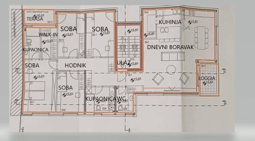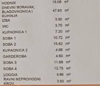 ulaznog hodnika prostranog dnevnog boravka s blagovaonicom i kuhinjom te izlazom na loggiu ostave povezane s kuhinjom odvojenog WC-a kupaonice s WC-om glavne spavaće sobe s vlastitom kupaonicom i walk-in ormarom još tri dodatne spavaće sobe, od kojih jedna ima balkon