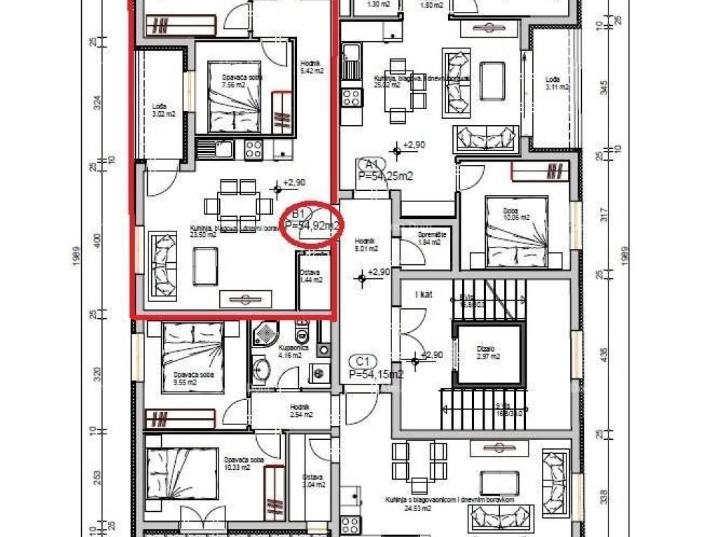 Apartment B1 includes a living room with a kitchen and dining area, 2 bedrooms, a bathroom, a hallway, a storage room, and a loggia.