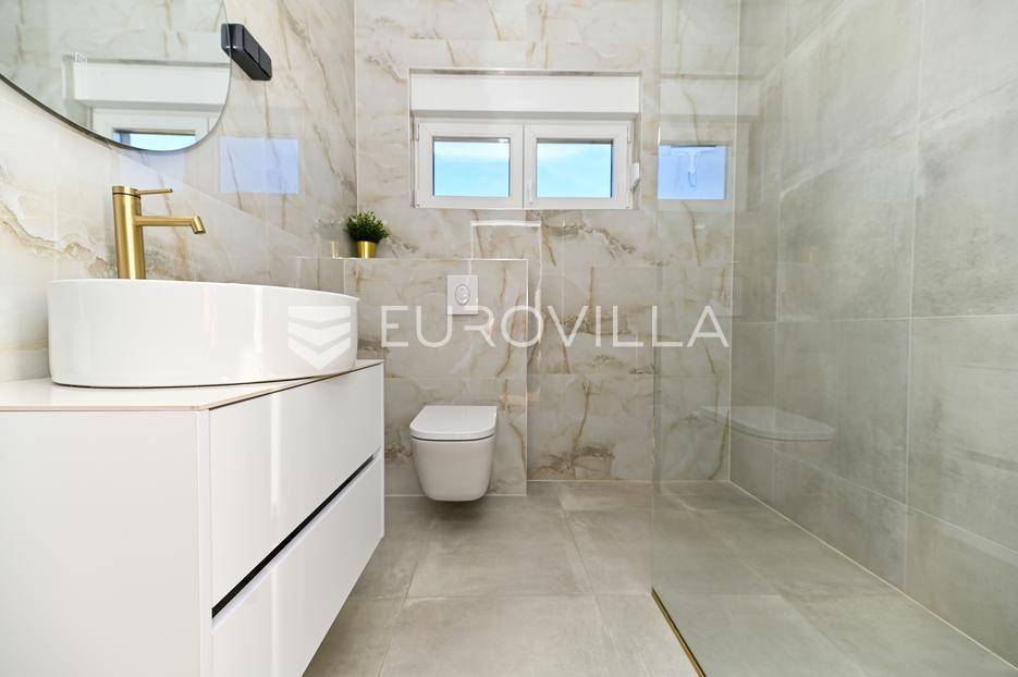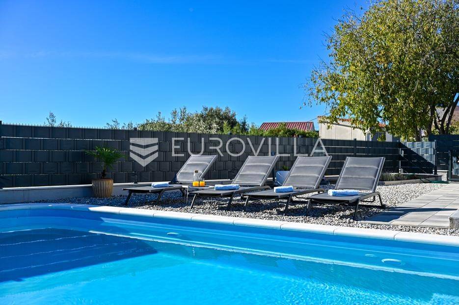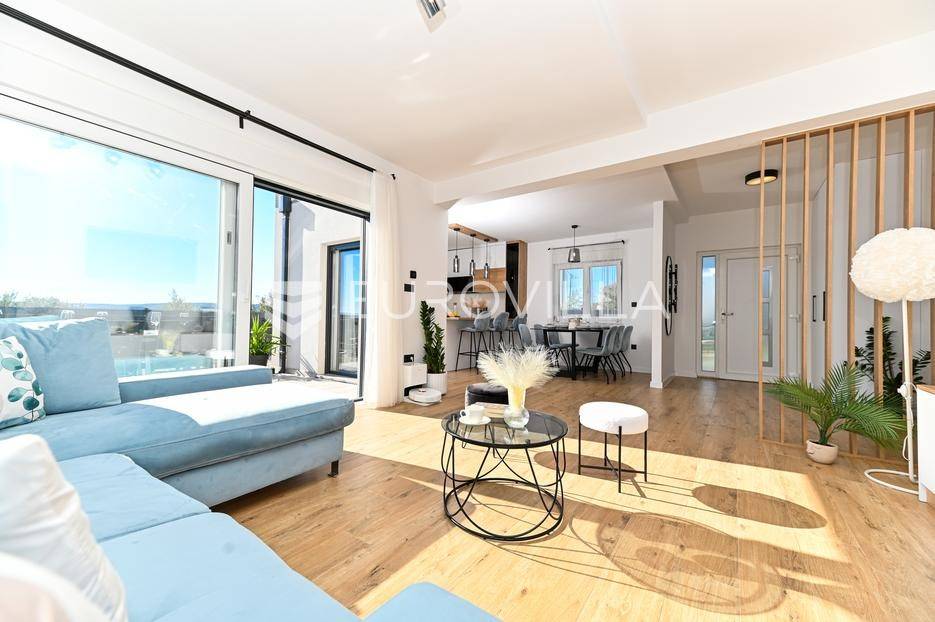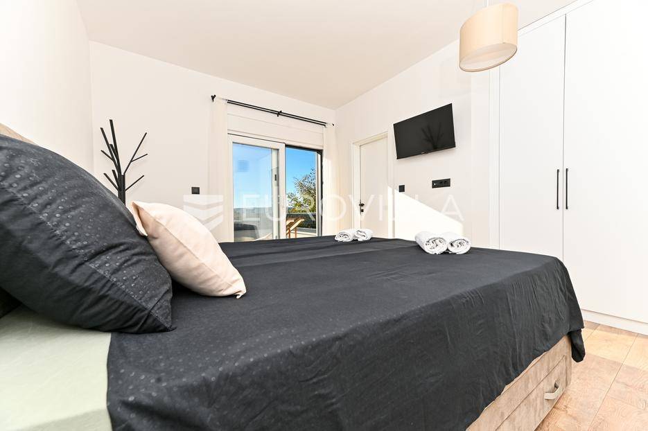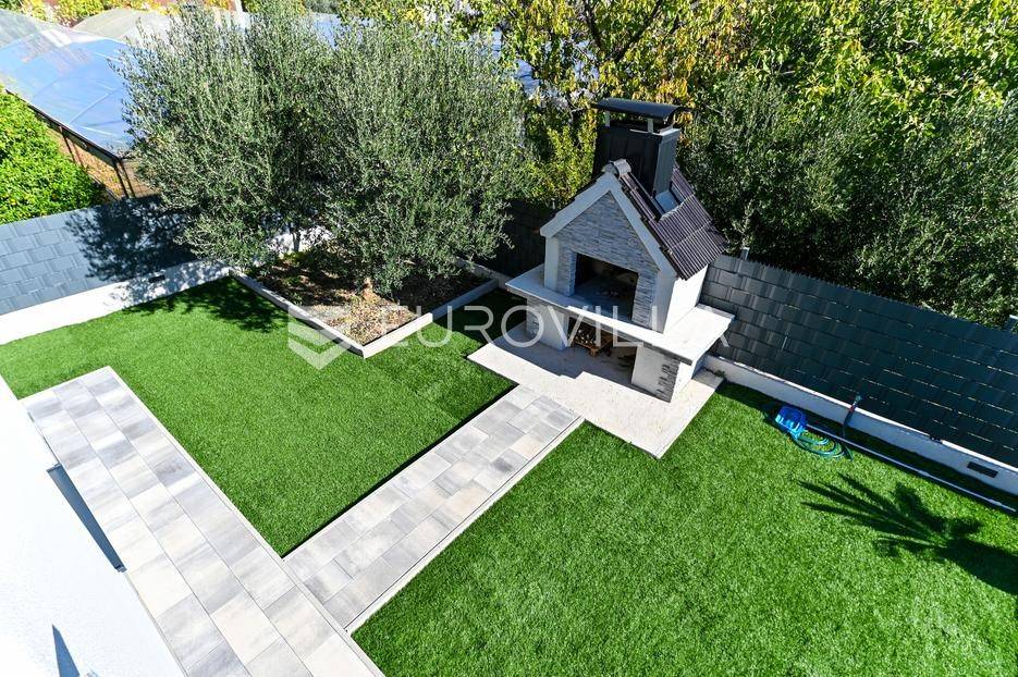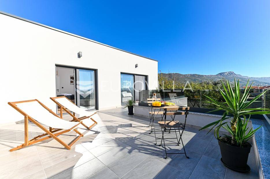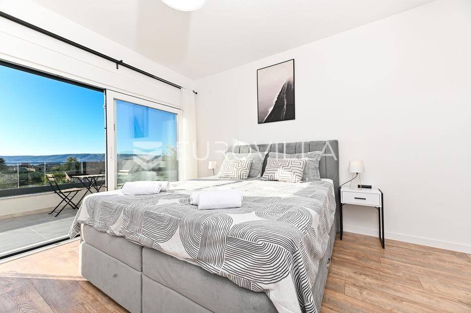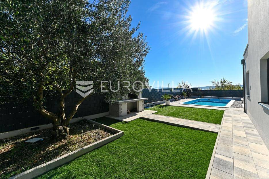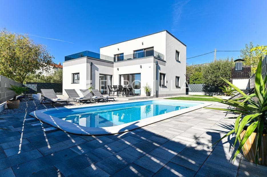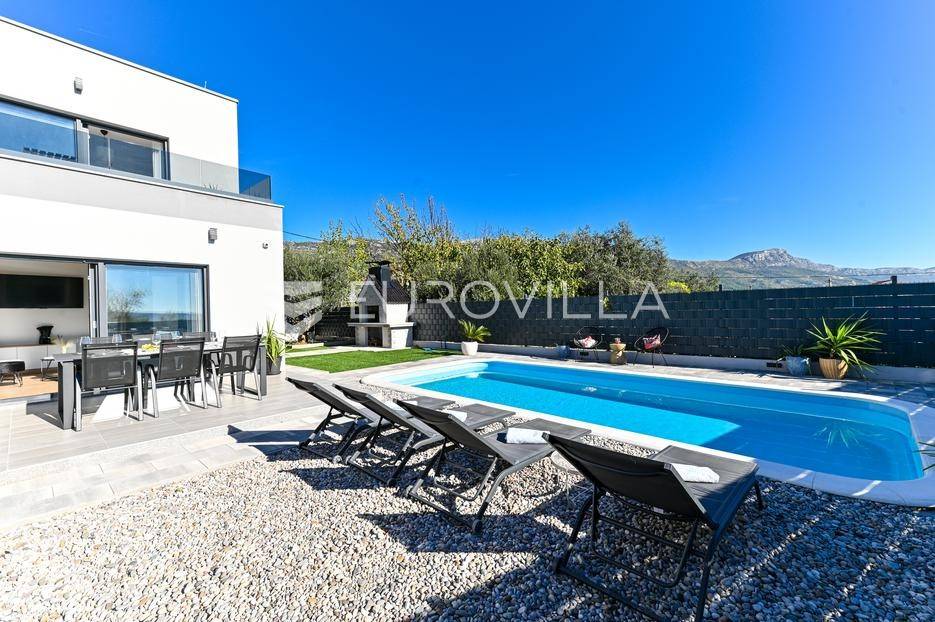 Kaštela, moderna kuća s vanjskim bazenom izgrađena 2025. godine, položena na parceli površine 490 m2. Razvedena je u dvije etaže, ukupne površine 160 m2.Prizemlje je podijeljeno na potpuno opremljenu kuhinju s blagovaonicom, dnevni boravak, praonicu, WC i jednu spavaću sobu s kupaonicom, dok se na katu nalaze dvije spavaće sobe s pripadajućim kupaonicama i izlazom na veliku terasu s pogledm na more.Potpuno ograđena i uređena okućnica krije bazen, sunčalište, prostor za druženje i roštilj.Lokacija dobra za život, pristupačna, a svi potrebni sadržaji u blizini.Za sve dodatne informacije, stojimo vam na raspolaganju.... Više na eurovilla.hr, ID: 946524