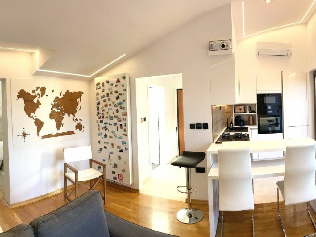 Osnovne informacije: Broj soba: 2-sobni Kat: 3. (zadnji kat) Ukupno katova u zgradi: 3 Stambena / neto površina: 57,00 m² Namještenost: potpuno namješten Broj parkirnih mjesta: 2 (garažno + vanjsko) Vanjski prostor: terasa