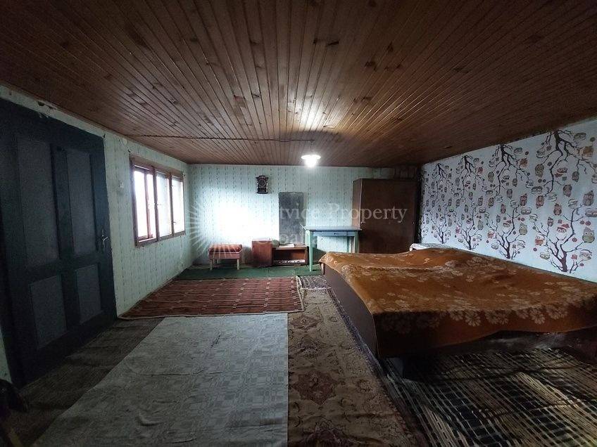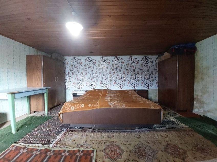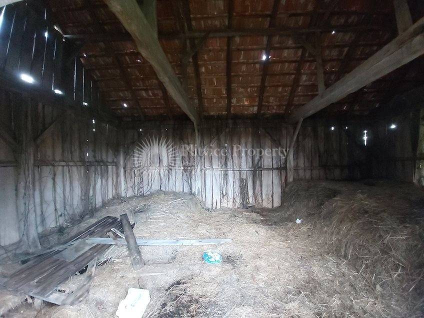 The main house is constructed from oak wood, reflecting traditional craftsmanship and rustic charm. It features a ground floor and first floor, with an attic that remains undeveloped, giving the potential for expansion or conversion to additional living space. On the property, there are also a hay barn and an animal shelter, adding versatility for hobby farming or storage.