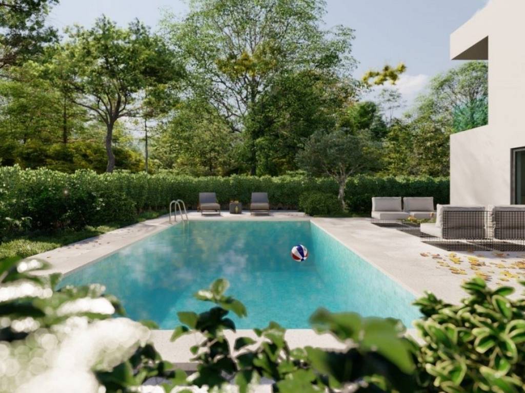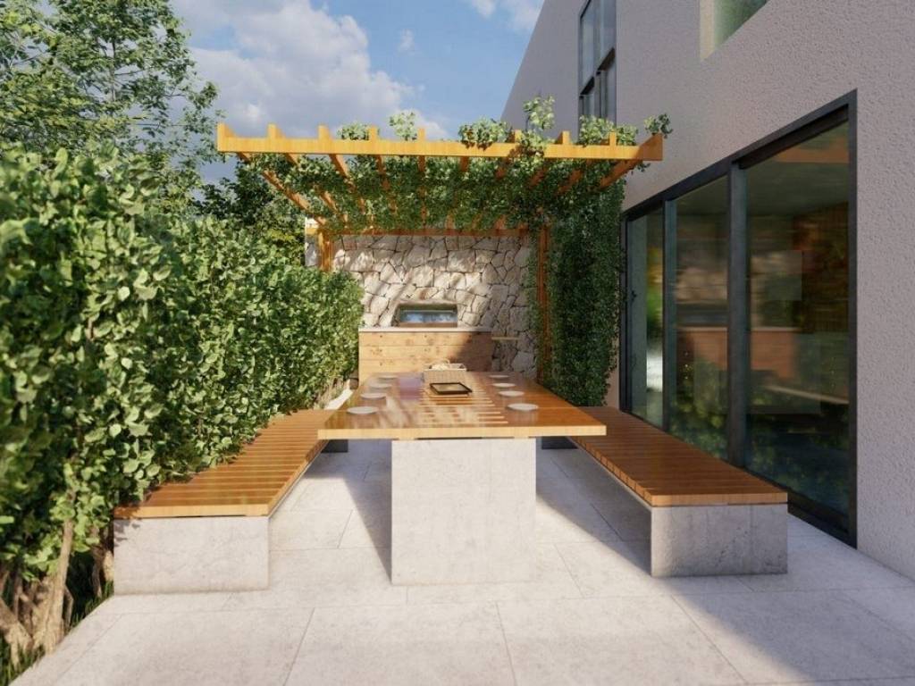 There is a covered summer kitchen in the outdoor area. The courtyard will be decorated with lawn and olive trees, which gives the space an authentic Mediterranean atmosphere.