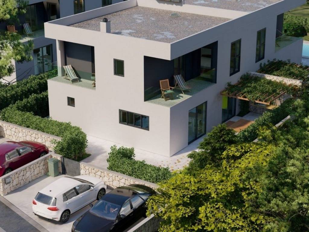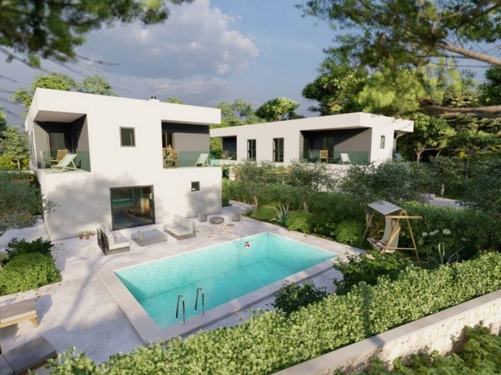 A modern semi-detached house under construction is for sale, located in a beautiful and quiet location on the outskirts of the city of Poreč, only 2000 meters from the sea. The planned completion of construction is by the end of 2026.