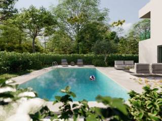 The outdoor area features a covered summer kitchen and a swimming pool. The courtyard will be decorated with lawn and olive trees, which gives the space an authentic Mediterranean atmosphere.