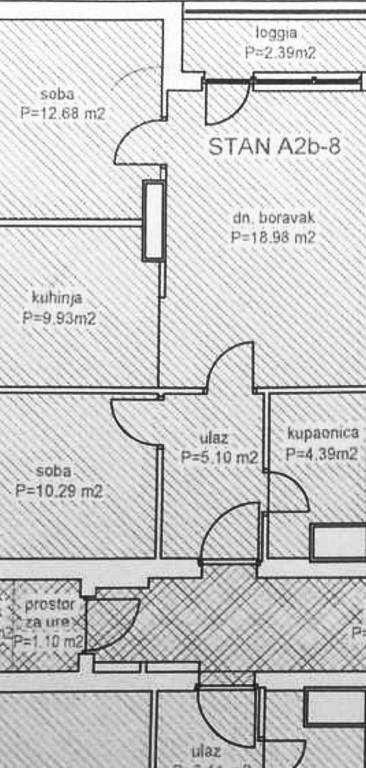 Stan se sastoji od ulaznog prostora, dvije spavaće sobe (jedna dječja), dnevnog boravka povezanog s blagovaonicom i kuhinjom, kupaonice te lođe s prekrasnim pogledom na Medvednicu, ukupne površine od 66m2. Tlocrt se nalazi u privitku. Stanu pripada i manja šupa veličine 2,32m2.