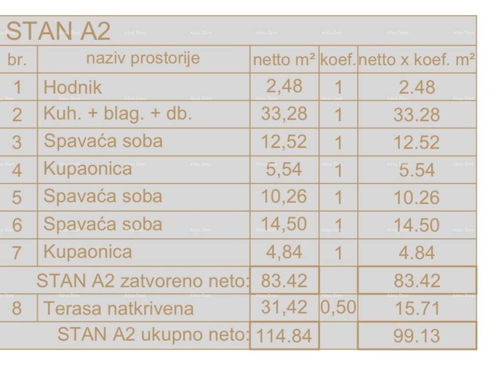Apartment , with an area of 114.84 m (net area 99.13 m), is located on the first floor of building A and consists of a hallway, living room with kitchen and dining area, 3 bedrooms, 2 bathrooms, and a large covered terrace.