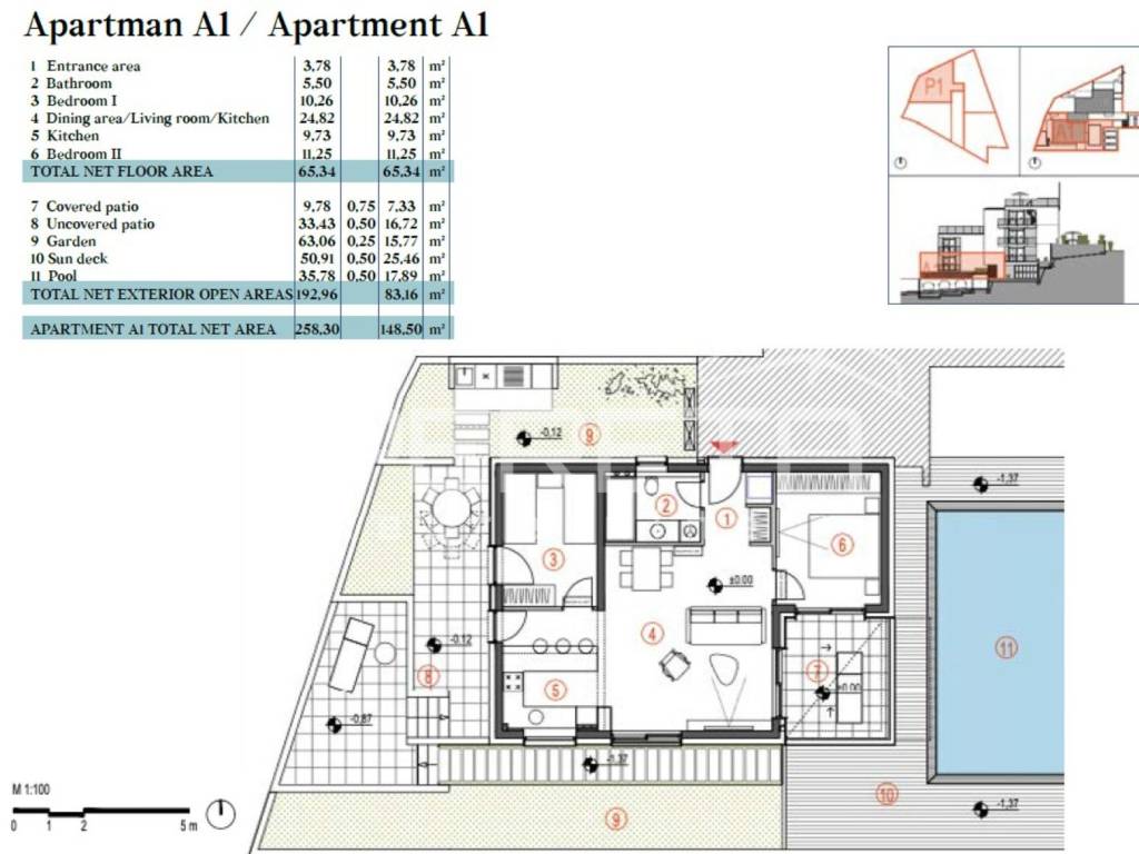 Apartment P1 A1 consists of 2 bedrooms, hallway, equipped kitchen, spacious living room, dining room, bathroom, summer kitchen, covered and uncovered terrace and fenced garden. It has a private swimming pool, sundeck with deck chairs as well as storage and parking space.