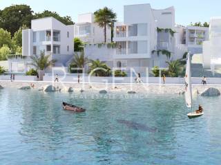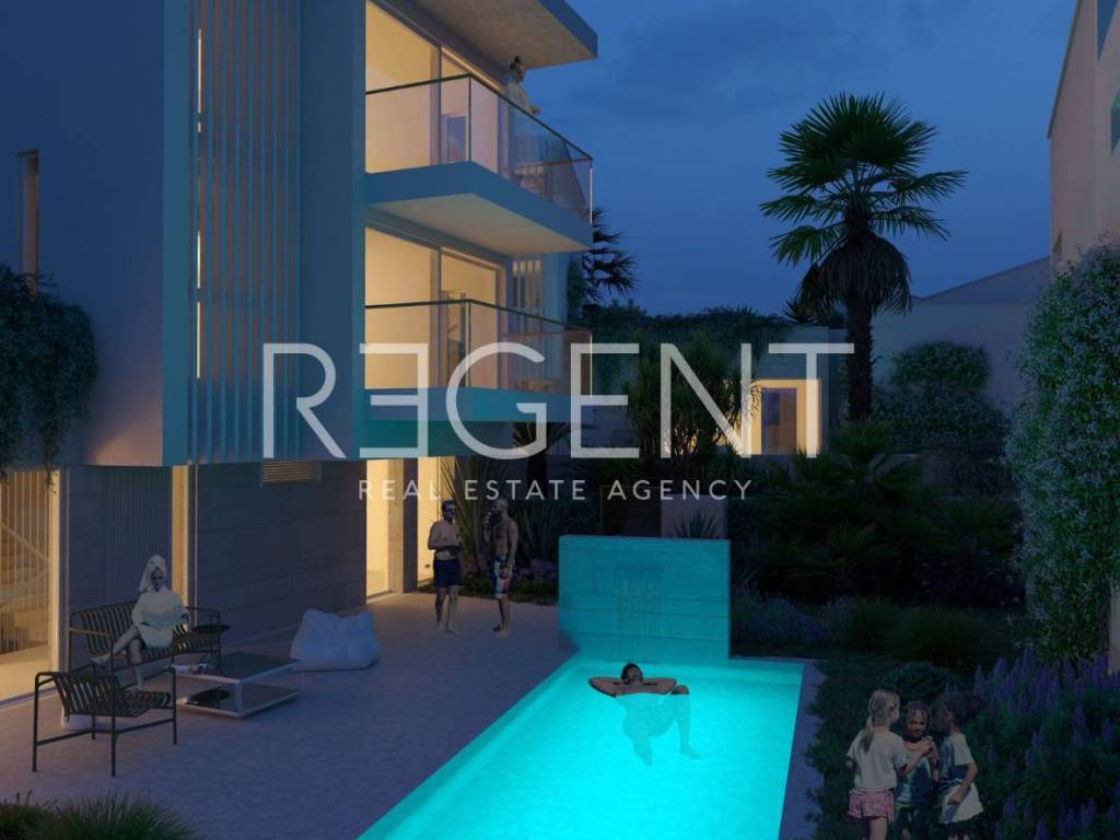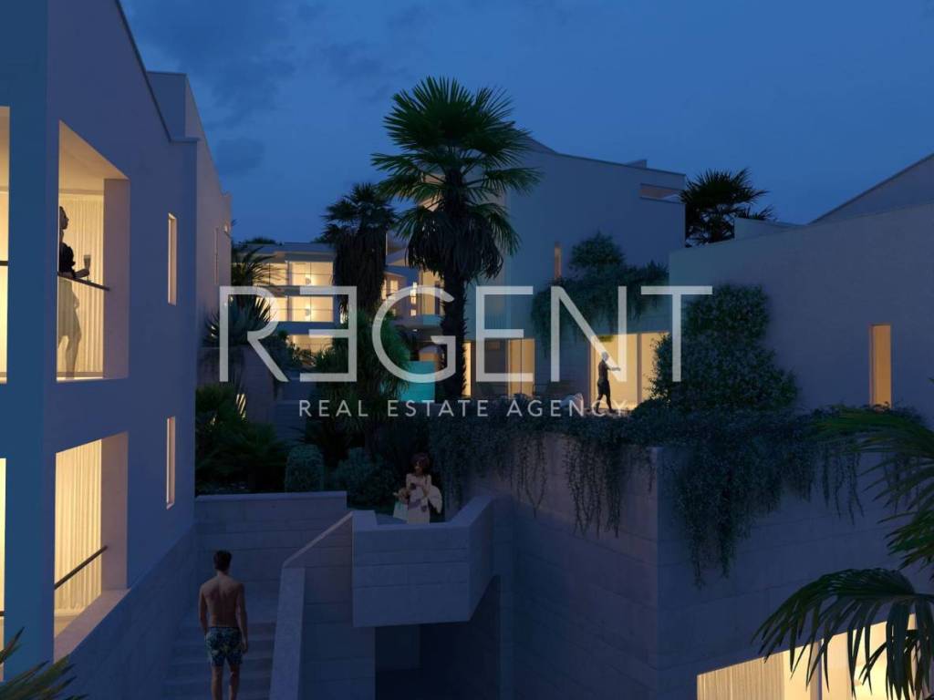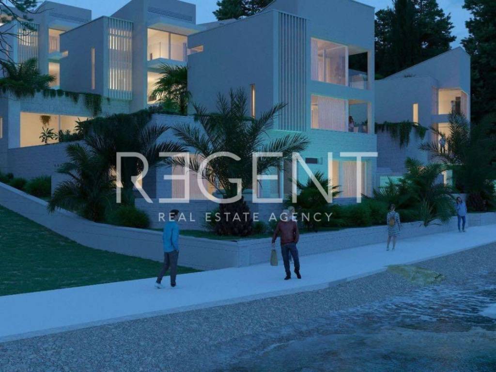 The modern luxury villa is located in the first row to the sea, along a landscaped promenade in the peaceful and sought-after part of Seget Donji. Thanks to the open panoramic view of the sea and islands and the layout on four floors, this property represents an exceptional opportunity for luxurious family living, but also for investment in high-category tourist rental. The villa extends through the basement, ground floor, first and second floor, and each space is carefully designed to provide maximum comfort and privacy. The basement has a private wellness and recreation area which includes a fitness area of 36.34 m², a sauna, a wellness zone, a bathroom, a laundry room, an entrance hall and a staircase with a corridor. The ground floor consists of the main living area with a spacious living room of 37.28 m², an entrance area with a staircase, a bathroom, an additional toilet and one bedroom. From the living room you exit onto a spacious terrace of 47.99 m² with a swimming pool, which offers an unobstructed view of the sea and is ideal for staying outdoors. On the first floor there are stairs, a bathroom, a spacious room of 24.23 m² and a loggia of 6.73 m² with an open view. The second floor follows the layout of the first and includes stairs, a bathroom, a room of 24.91 m² and a loggia of 6.73 m², also with a panoramic view of the sea and islands. The property is equipped with underfloor heating, air conditioning and security doors, and the villa also has a garage, which further increases the level of practicality and comfort. Located right by the sea and promenade, the villa offers peace and privacy, while at the same time it is excellently connected by transport. In the immediate vicinity is the historical center of Trogir, while Split is only a short drive away. The proximity of all important facilities, restaurants, shops and the airport further emphasizes the attractiveness of this location. Payment is organized in construction phases: 30% upon signing, 30% during construction, 30% before completion and 10% upon completion and handover. For more information or to arrange a viewing of this exclusive villa in the first row to the sea, feel free to contact us.