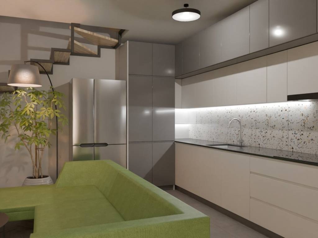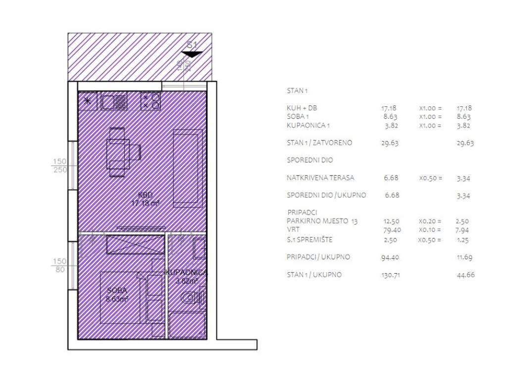 The apartment has a total living area of 44 m2, a simple but functional floor plan consists of a main entrance, living room and kitchen, as well as a bathroom and a bedroom. The apartment has a terrace and a garden of 86 m2.