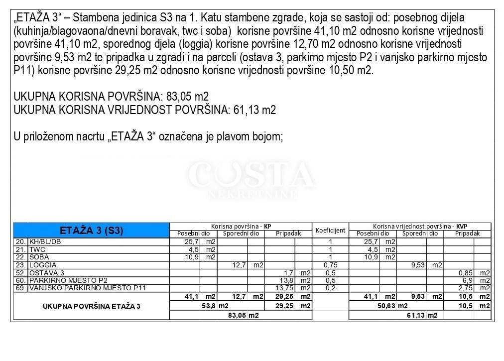 An apartment under construction is for sale in the Crvene kuće area in Zadar. The apartment with a living area of ​​41.1 m2 is located on the first floor of a small residential building with eight units. It consists of a spacious living room, kitchen and dining room, one bedroom, bathroom, hallway and a loggia of an additional 12.7 m2. The apartment also has a storage room, one outdoor and one garage parking space. The total usable area of ​​the apartment together with all the accessories is 83.05 m2 (K.V. 61.13 m2).