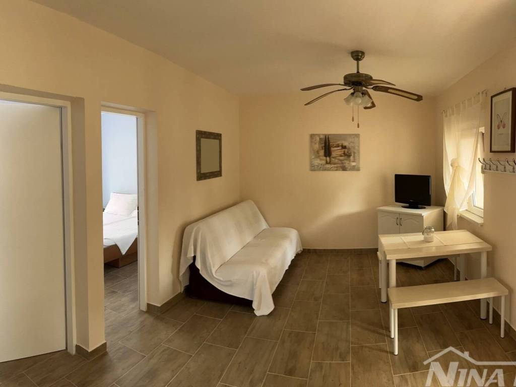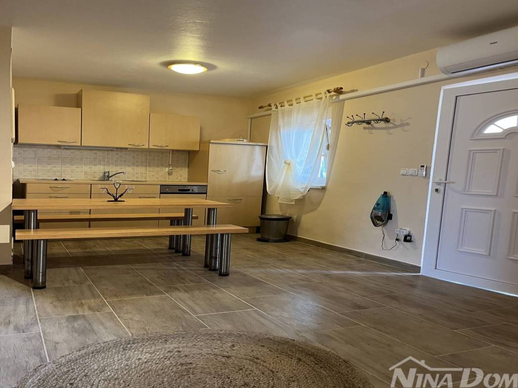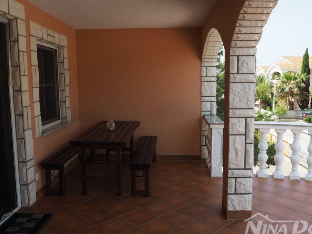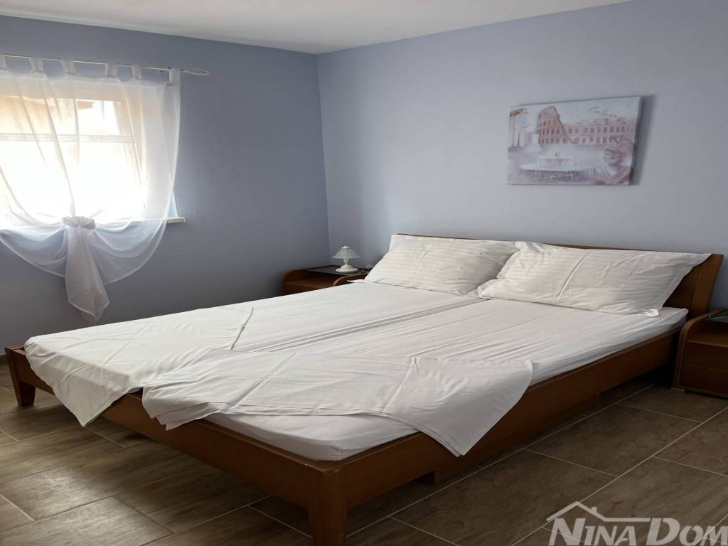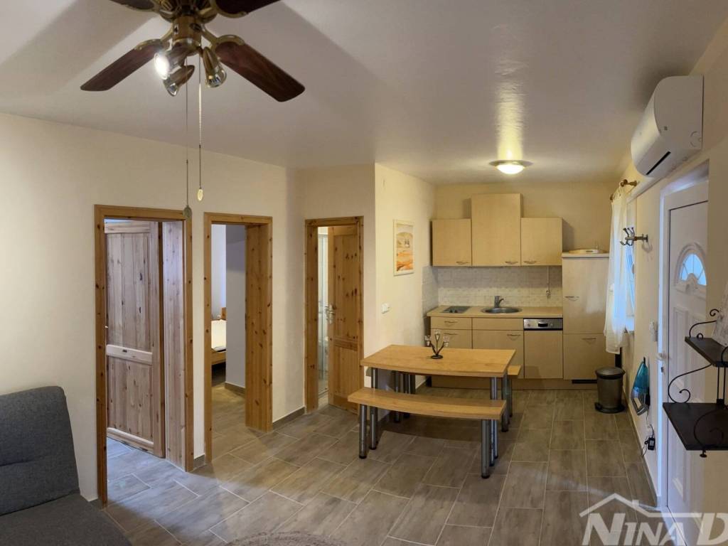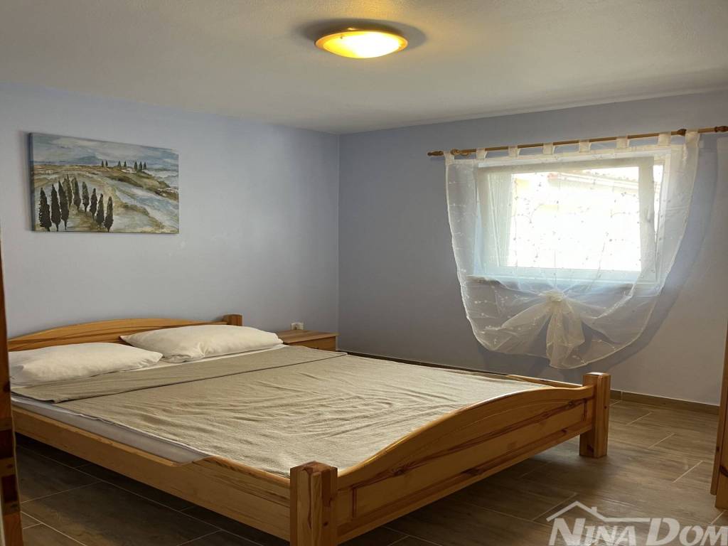 Južna strana otoka Vira, nekretnina koja se sastoji od prizemlja i kata s tri stambene jedinice, vanjskih tlocrtnih dimenzija 15,04 x 12.59 met. Prizemlje: dva identična apartmana od kojih svaki ima dvije spavaće sobe, kuhinja s dnevnim boravkom, kupaona, natkrivena terasa. Kat: vanjske stepenice, kuhinja s blagovaonicom, dvije spavaće sobe, kupaona, terasa koja je djelom natkrivena a dijelom otvorena, manja ostava na terasi. Kompletno je opremljena i kao takva se prodaje (osim osobnih stvari prodavatelja). Klimatizirana. Okućnica uređena s parkirnim mjestima. Voda: dvije cisterne za vodu od kojih svaka ima 12 m3. Priključak na elektro mrežu. septička jama. Od lijepo uređene plaže udaljena je svega 160 metara.