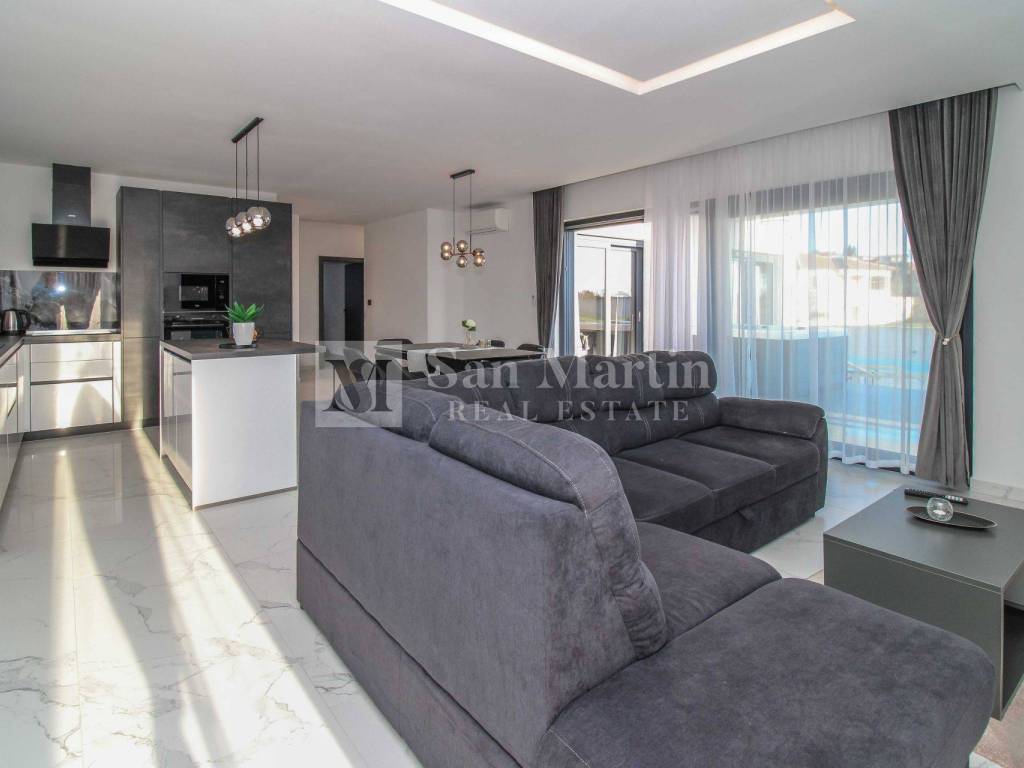 The property is organized as a single-storey house with a carefully designed layout. The central part of the house is an open living area that combines the kitchen, dining room and living room, with plenty of natural light and direct access to a covered terrace.