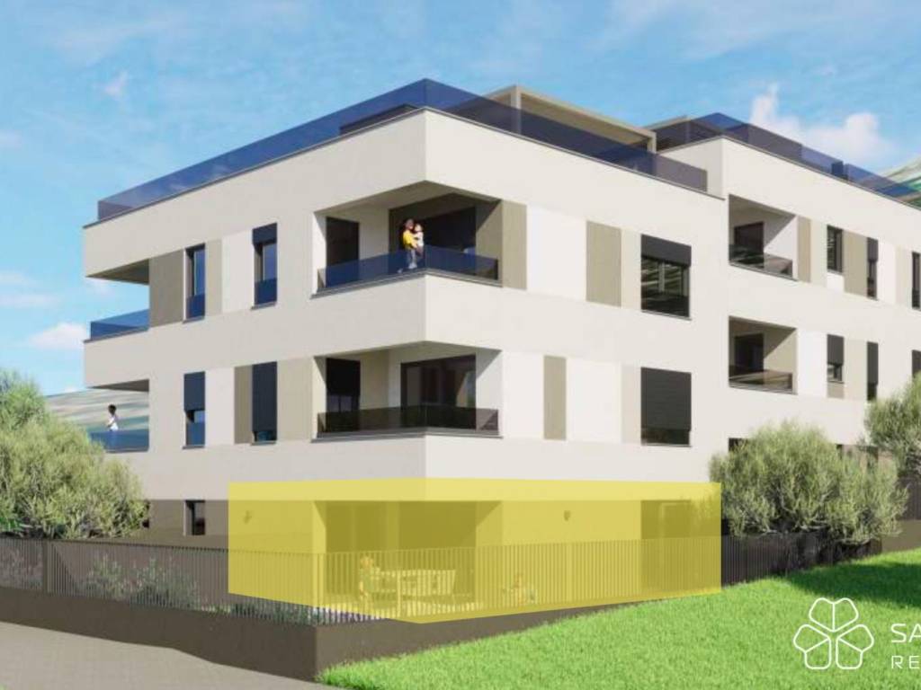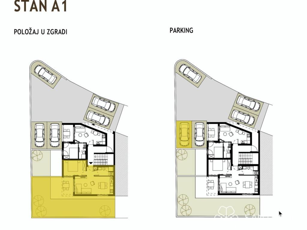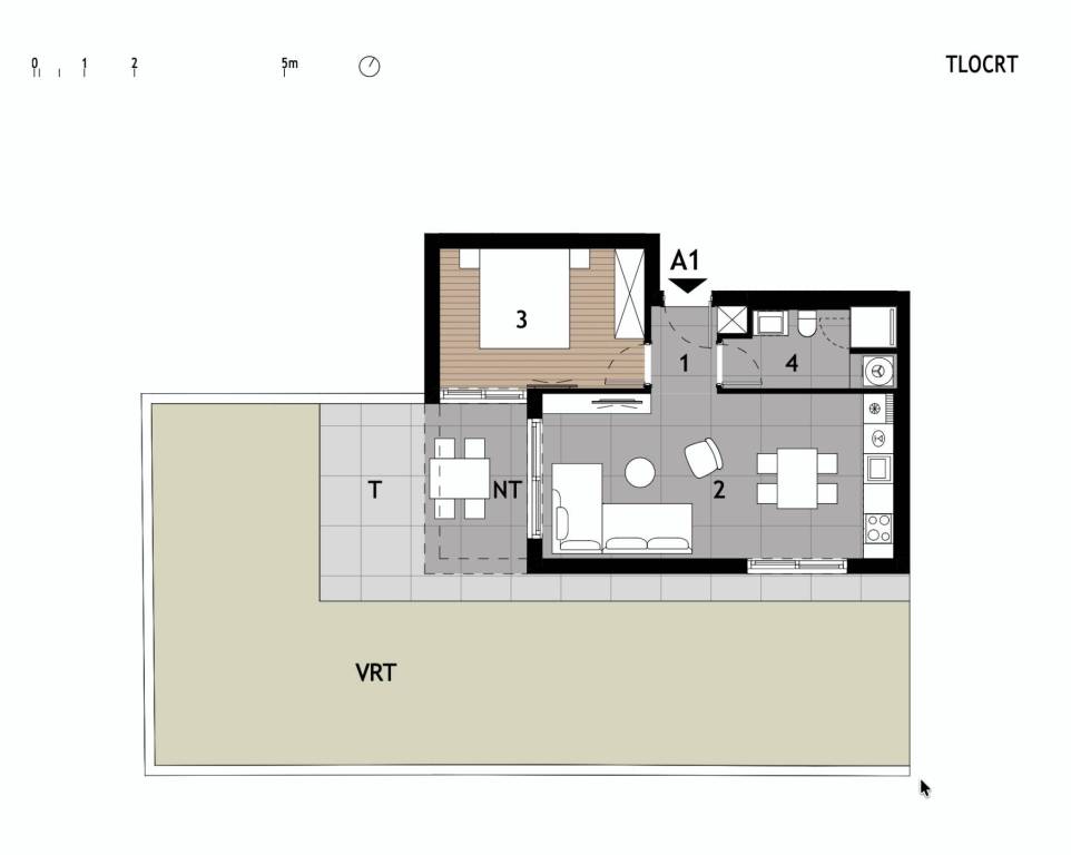 Apartment A1 - (ground floor) - living area 42.46 m2 (1 bedroom + 1 bathroom) + covered terrace (6.97 m2 - SW) + uncovered terrace (14 m2 - SW) + garden (68 m2) + outdoor parking space; total net area 69.21 m2 = 281,000 EUR (including VAT)