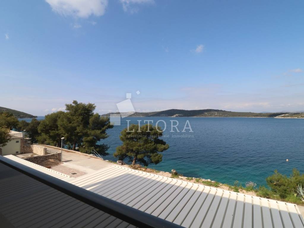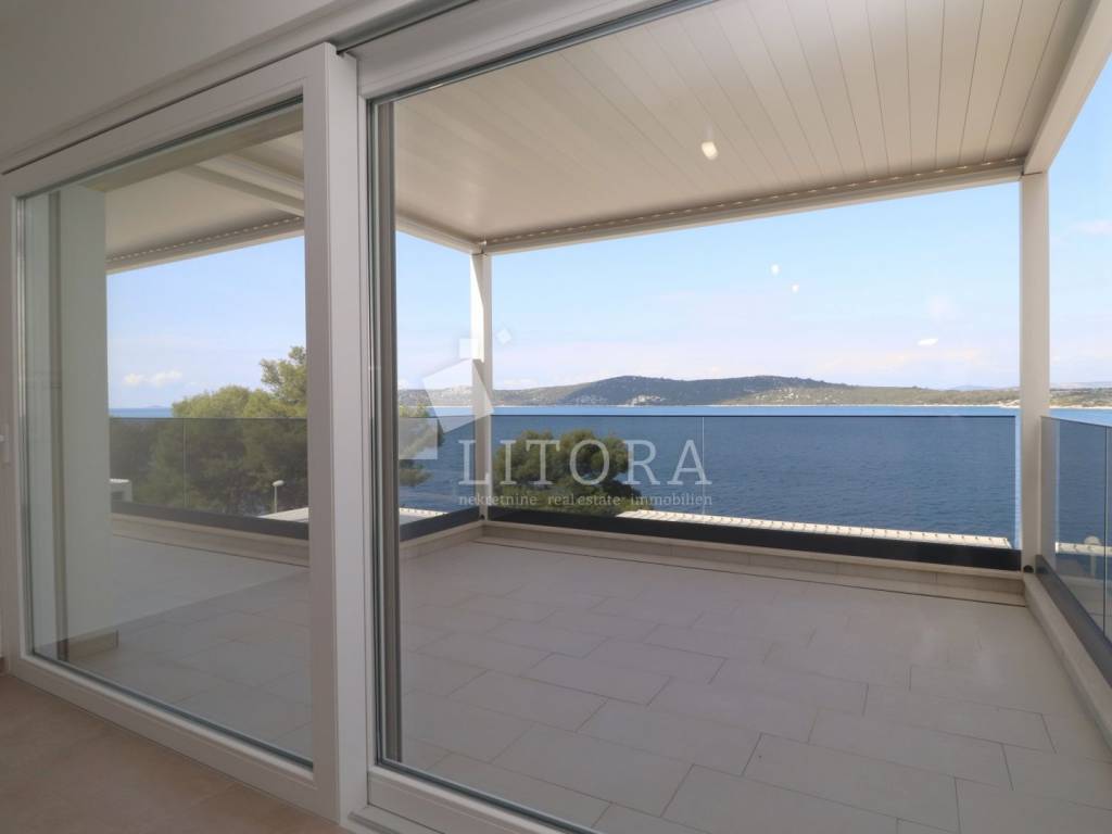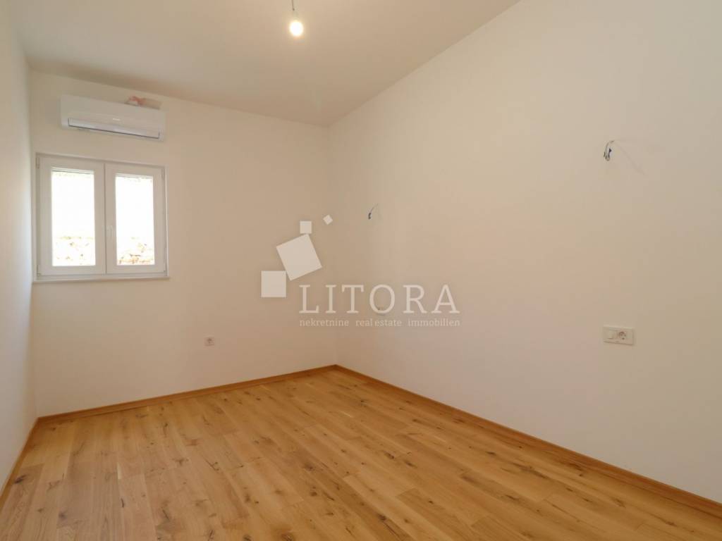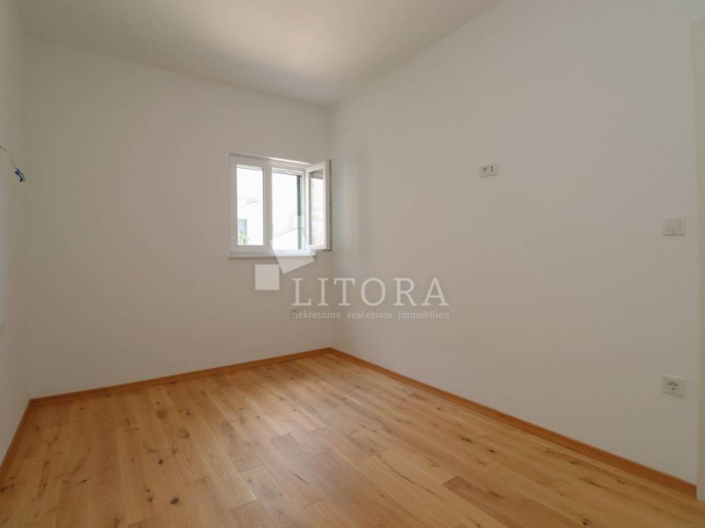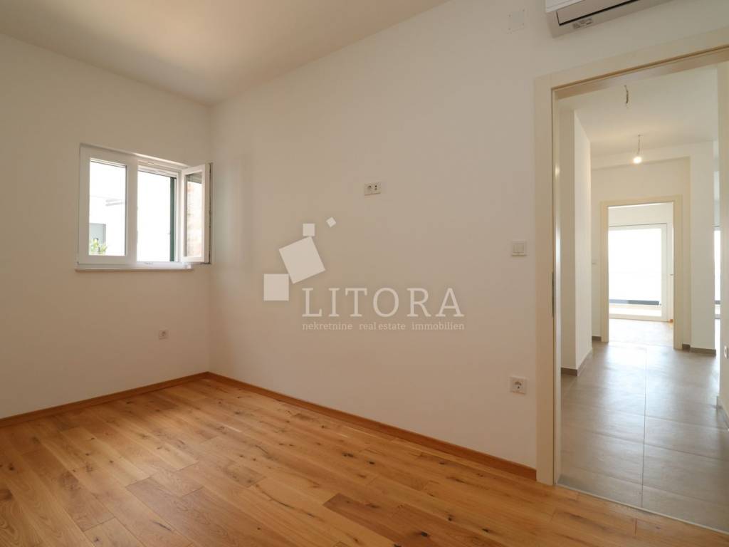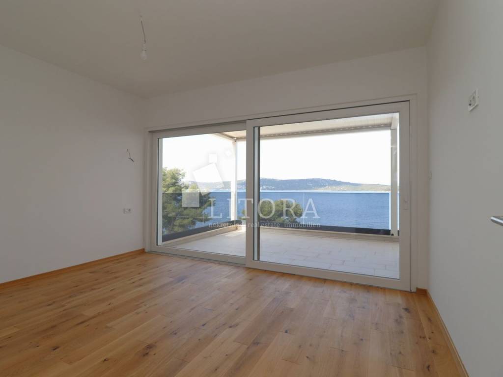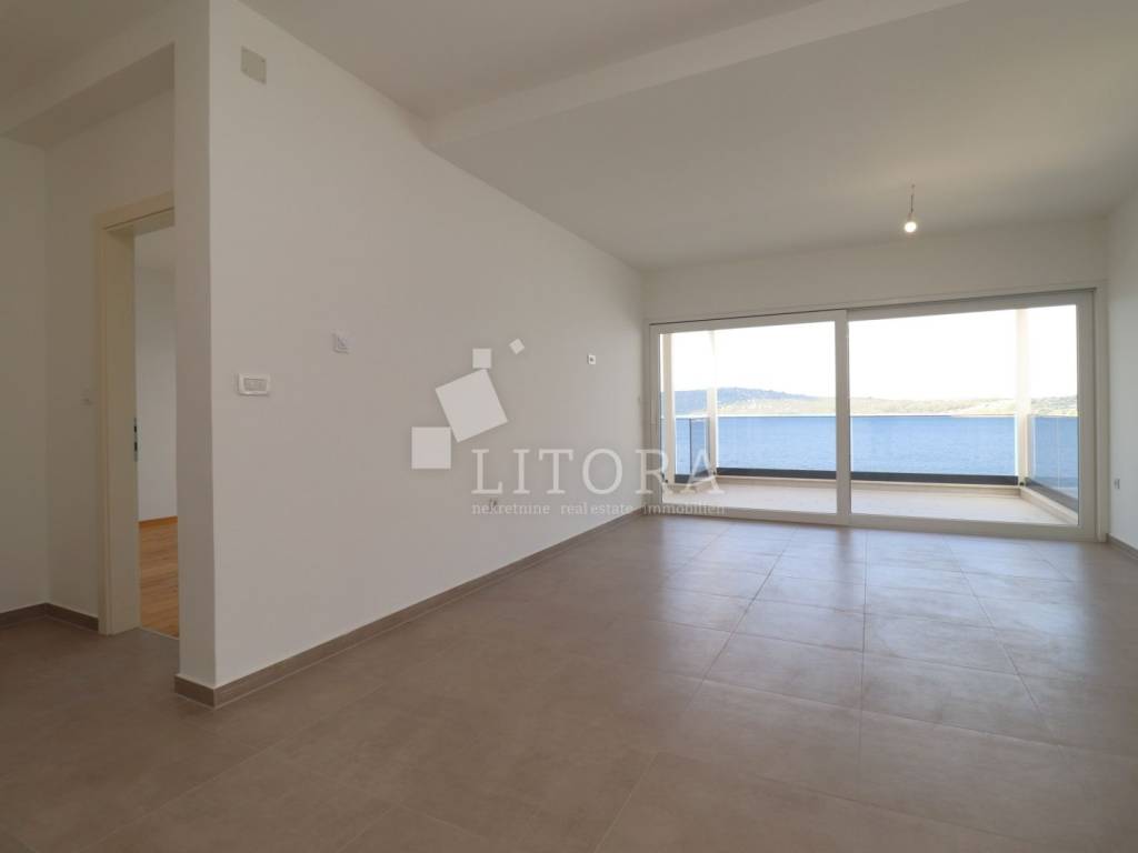 Šparadići – first row to the sea/beach, newly built three-bedroom apartment with a large terrace. The apartment is located on the 1st floor of a newly built residential building and is west-facing. The total usable area is 115,27m² and consists of an entrance hall, a kitchen with dining area and living room with access to a covered terrace of 31,50 m². The apartment also includes an additional hallway, three bedrooms, and a bathroom. The apartment comes with one parking space. It is ready for immediate occupancy and is equipped with electric roller shutters, insect screens, thermal façade insulation, parquet flooring in the bedrooms, and shutters. The distance to the well-maintained beach is only 10 meters.